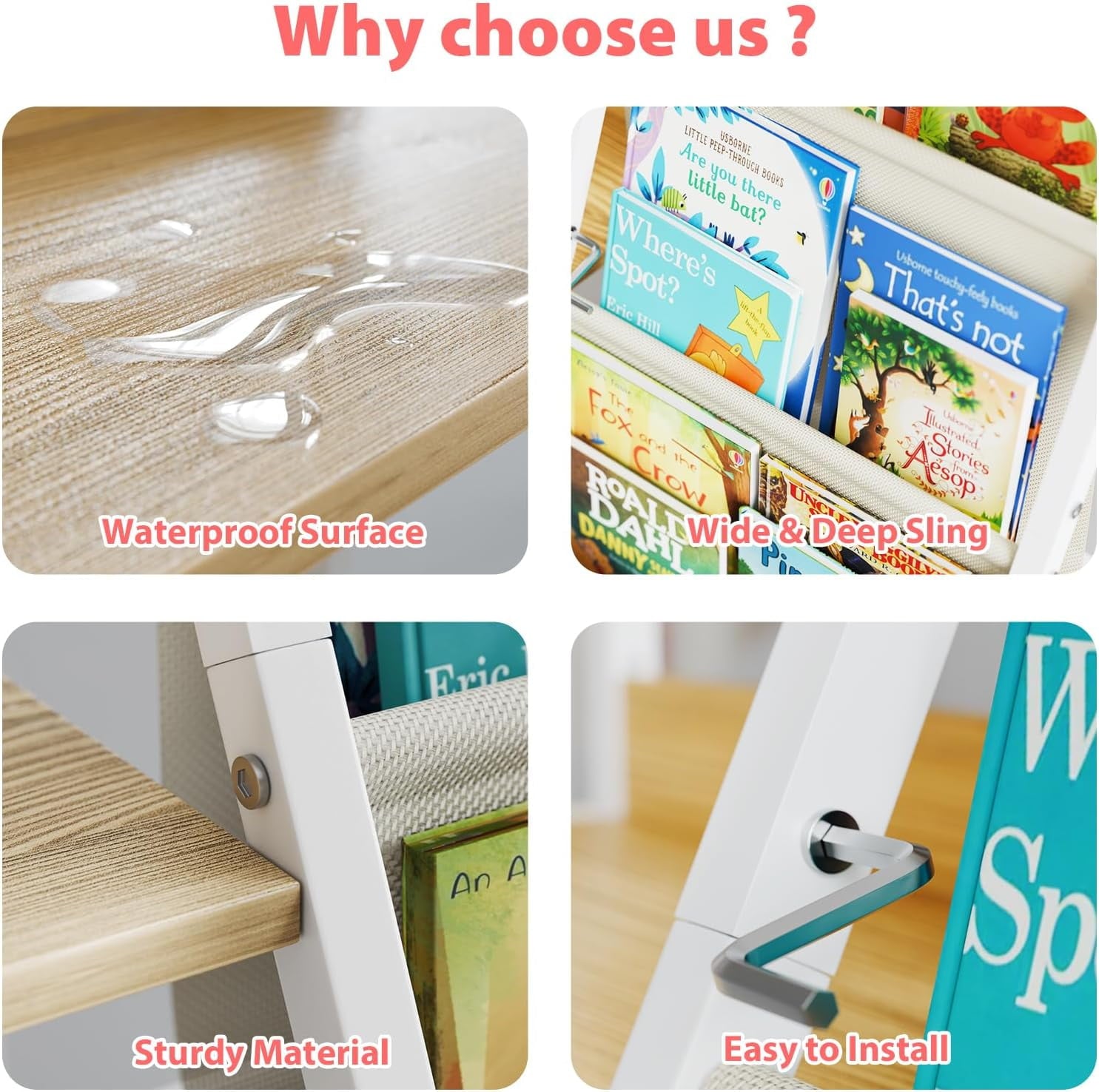 - [Natural Eco-Friendly Material]: This sturdy and reliable toddler bookshelf for kids features wooden boards and cotton linen fabric, easy to clean. It can hold many books and toys without tearing. It also comes with anti-tip straps and non-slip feet, not easy to collapse. Packaging includes all accessories.