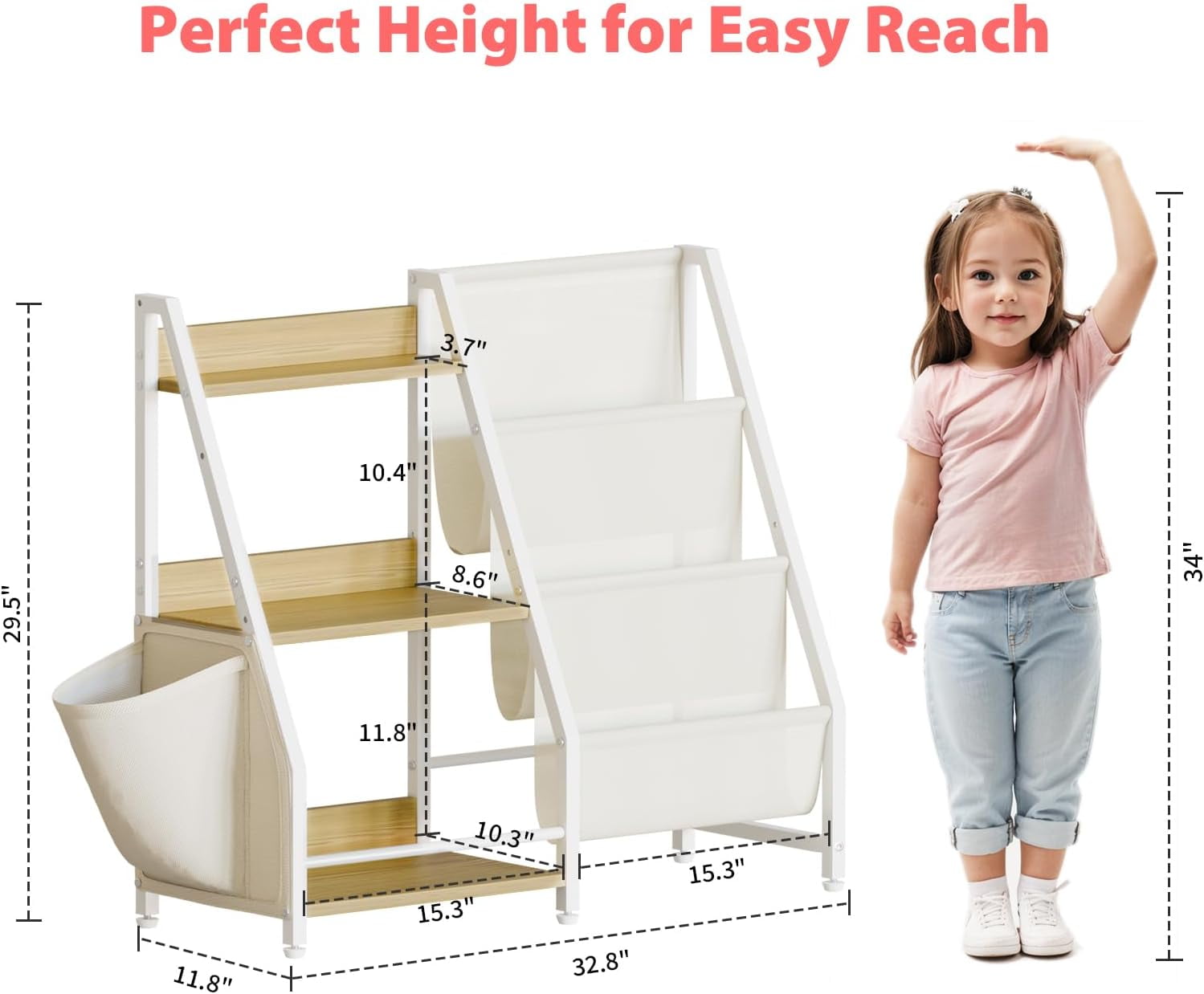 [Easy to Assemble 2-in-1 Design]: This space-saving kids bookshelf features 3-tier book storage sling pockets and 3-tier wooden toy storage providing multiple organization options. The book storage bag displays books with front covers and is the perfect height for toddlers and children to easily identify and access.Dimensions: 32.8 x 11.80 x 29.5 inches.