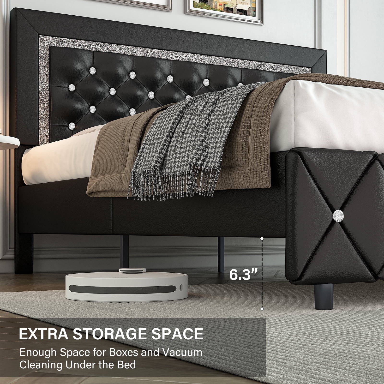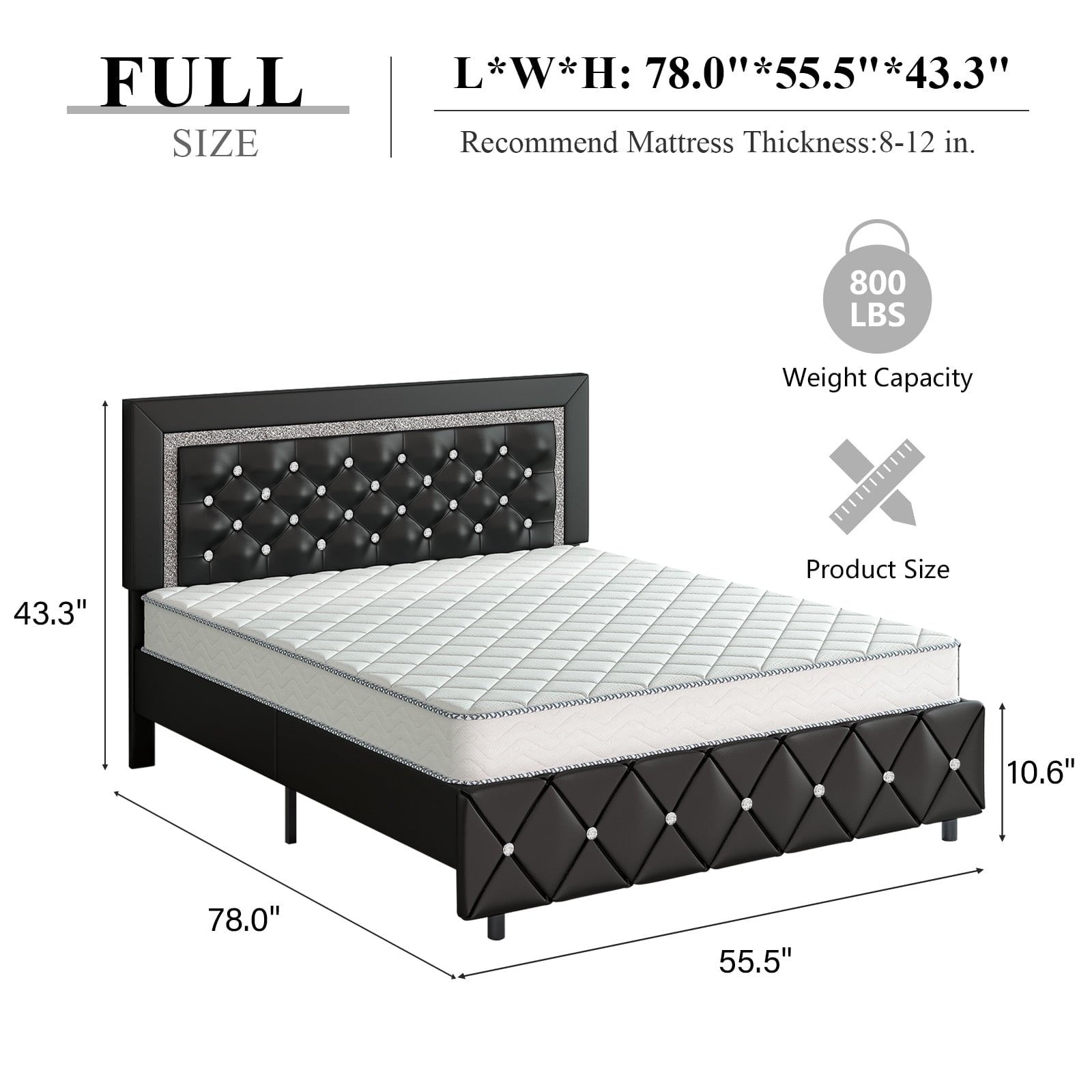 - ----- An adjustable diamond headboard is offered for this full bed frame, which can accommodate any mattress height. The sparkling diamonds will encircle you and bring a luxurious feeling. With its crystal tufted upholstery and faux leather wrapping, this modern black full size bed frame is elegant and comfortable. It can harmonize perfectly with any bedroom design.