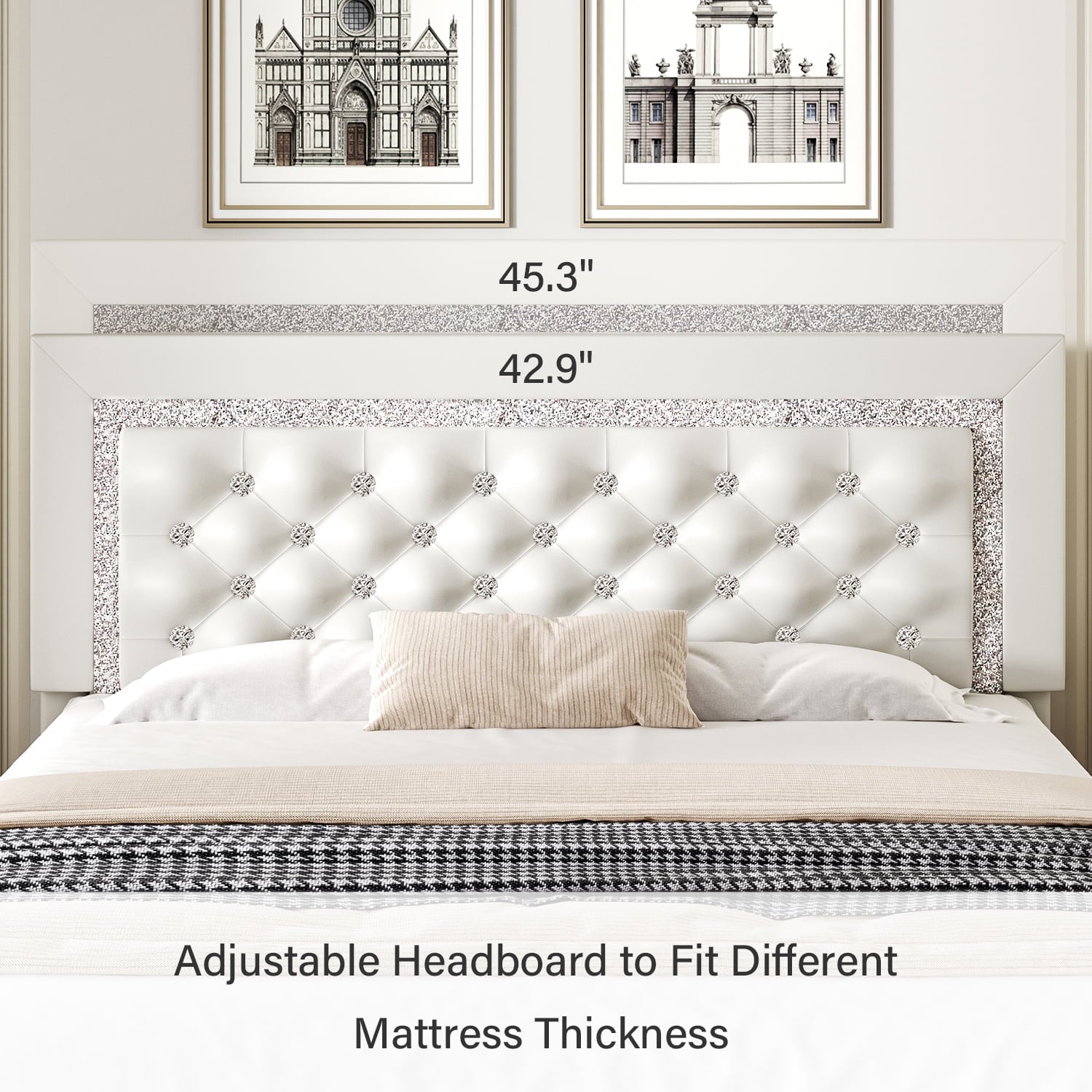 - Diamond Headboard----- An adjustable diamond headboard is offered for this full bed frame, which can accommodate any mattress height. The sparkling diamonds of the bed will encircle you and bring a luxurious feeling. With its crystal tufted upholstery and faux leather wrapping, this modern white full size bed frame is elegant and comfortable. It can harmonize perfectly with any bedroom design.