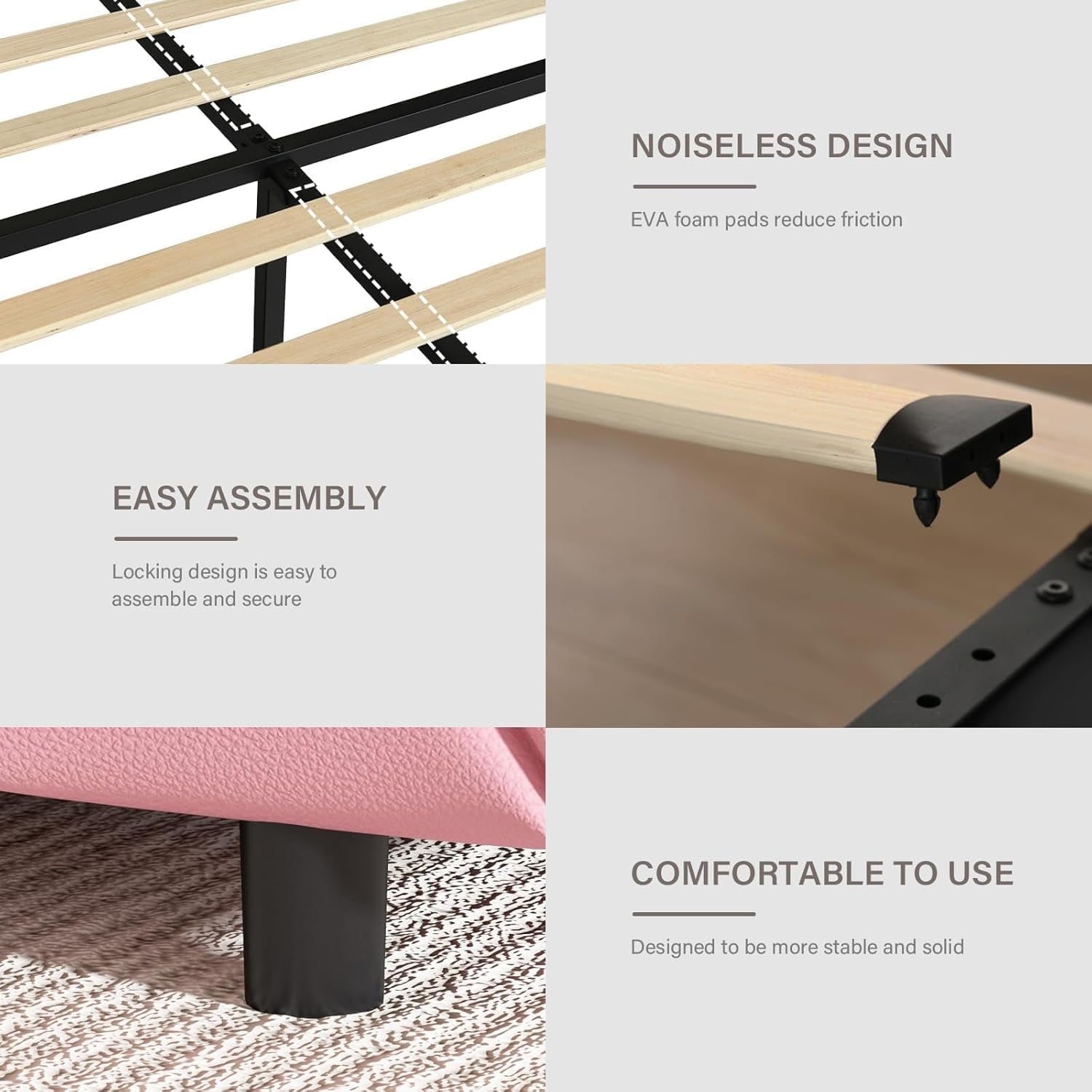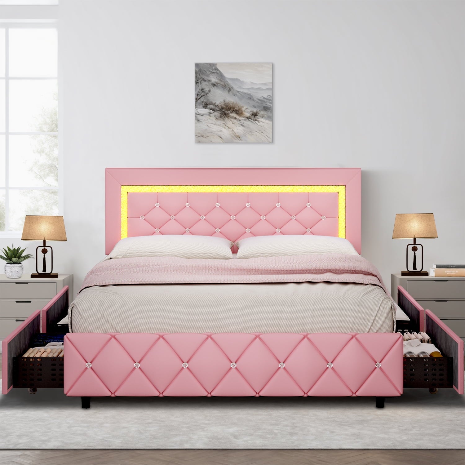 - Diamond Tufted Headboard ------ This pink full bed frame comes with an adjustable diamond headboard that can fit any mattress height. The dazzling gems will envelop you and give you an opulent sense. This sleek and cozy modern led bed frame with PU leather wrapping and crystal tufted upholstery. It may blend in beautifully with any kind of bedroom.