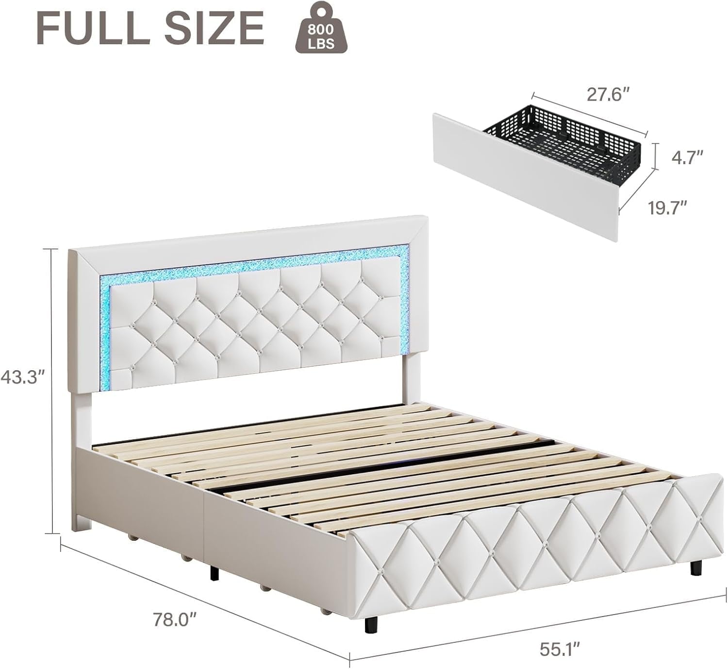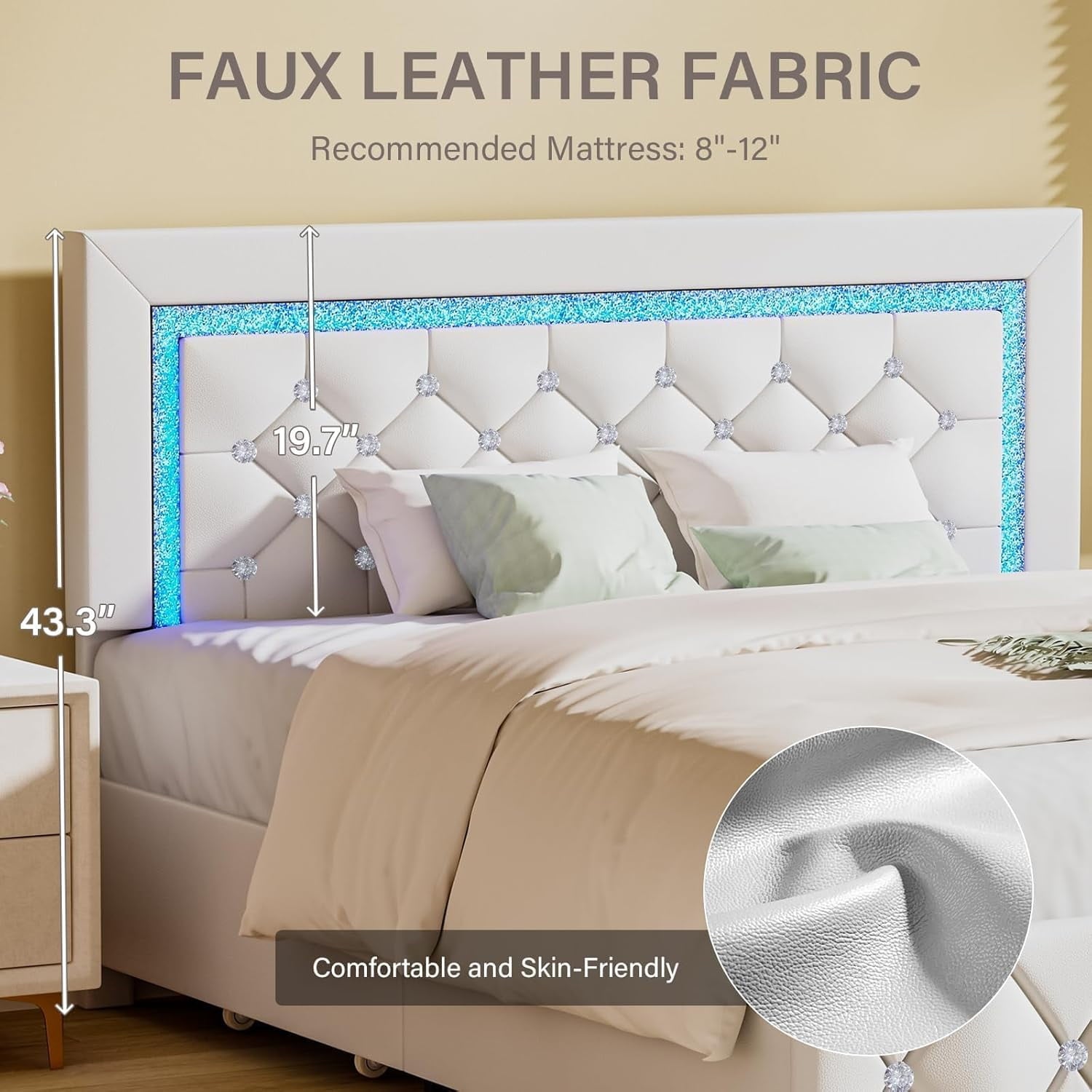 - Diamond Tufted Headboard ------ This white full bed frame comes with an adjustable diamond headboard that can fit any mattress height. The dazzling gems will envelop you and give you an opulent sense. This sleek and cozy modern led bed frame with PU leather wrapping and crystal tufted upholstery. It may blend in beautifully with any kind of bedroom.