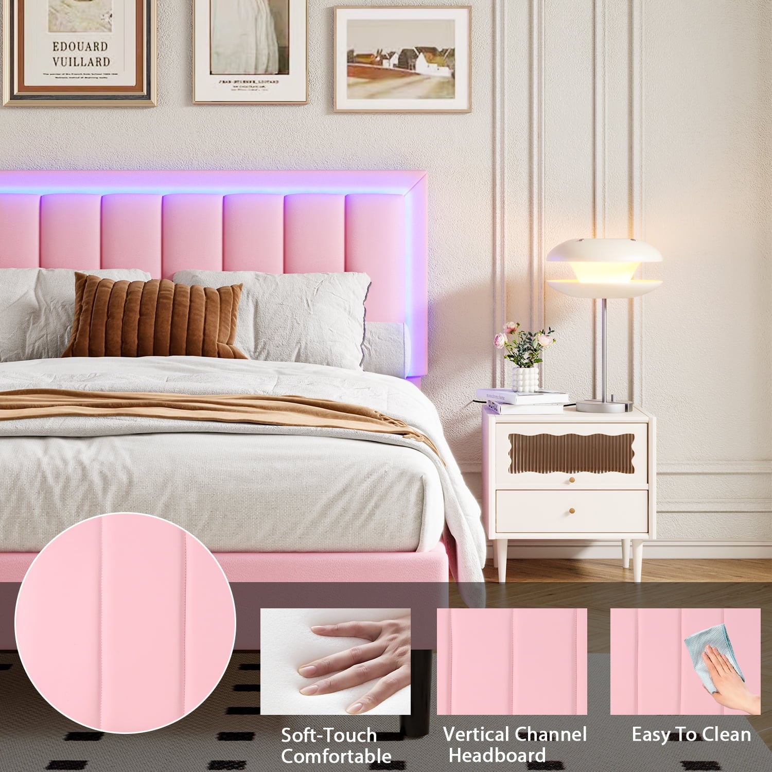 - ----- The pink king bed frame with led light combines foam fill with line design. The high-grade Faux Leather fabric is very comfortable and skin-friendly, the LED light headboard with a high-quality, understated look. The bed frame king size with headboard can trim and glamorizes any room.