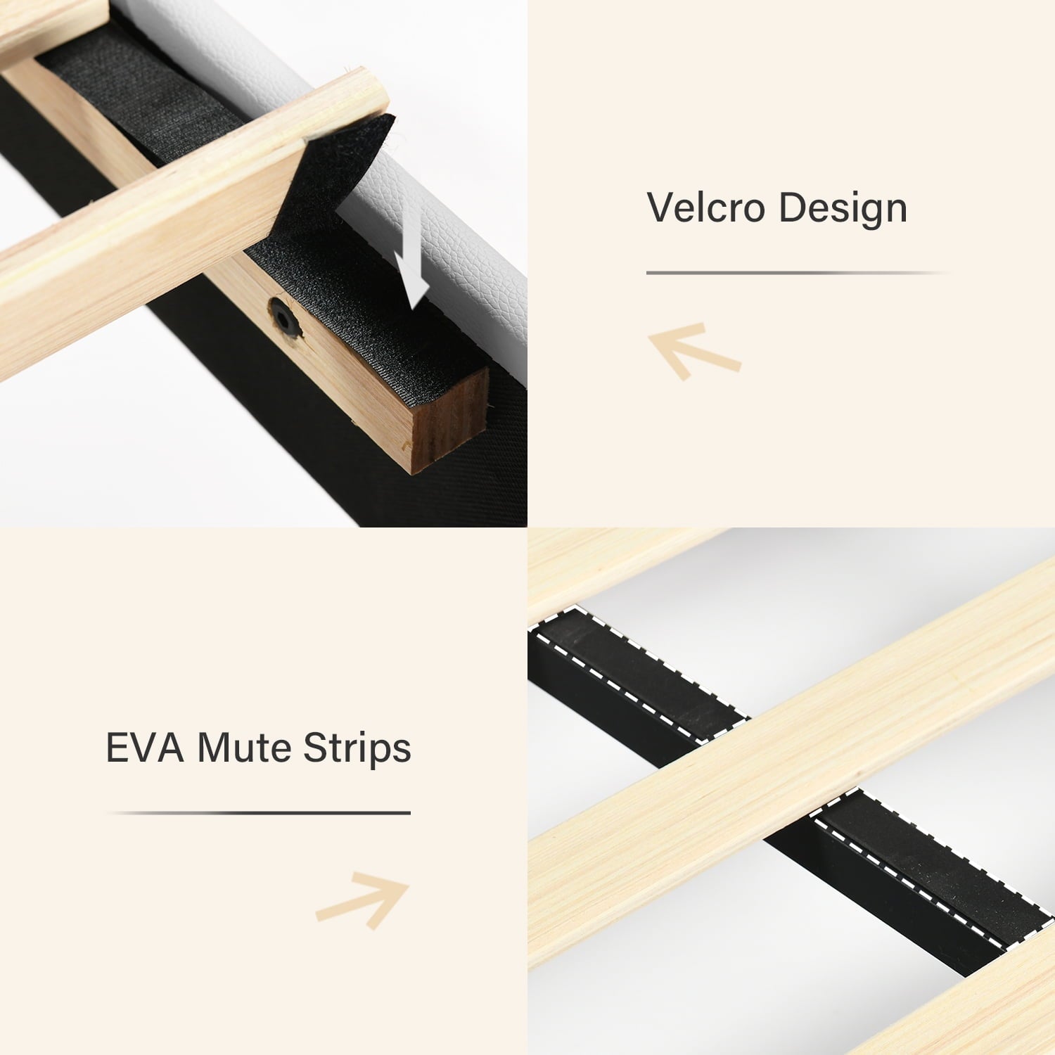- Sturdy Construction ----- This white bed frame is made sturdy by the Velcro-fastened slats and center steel leg, which are further reinforced by the post-shaped legs.
