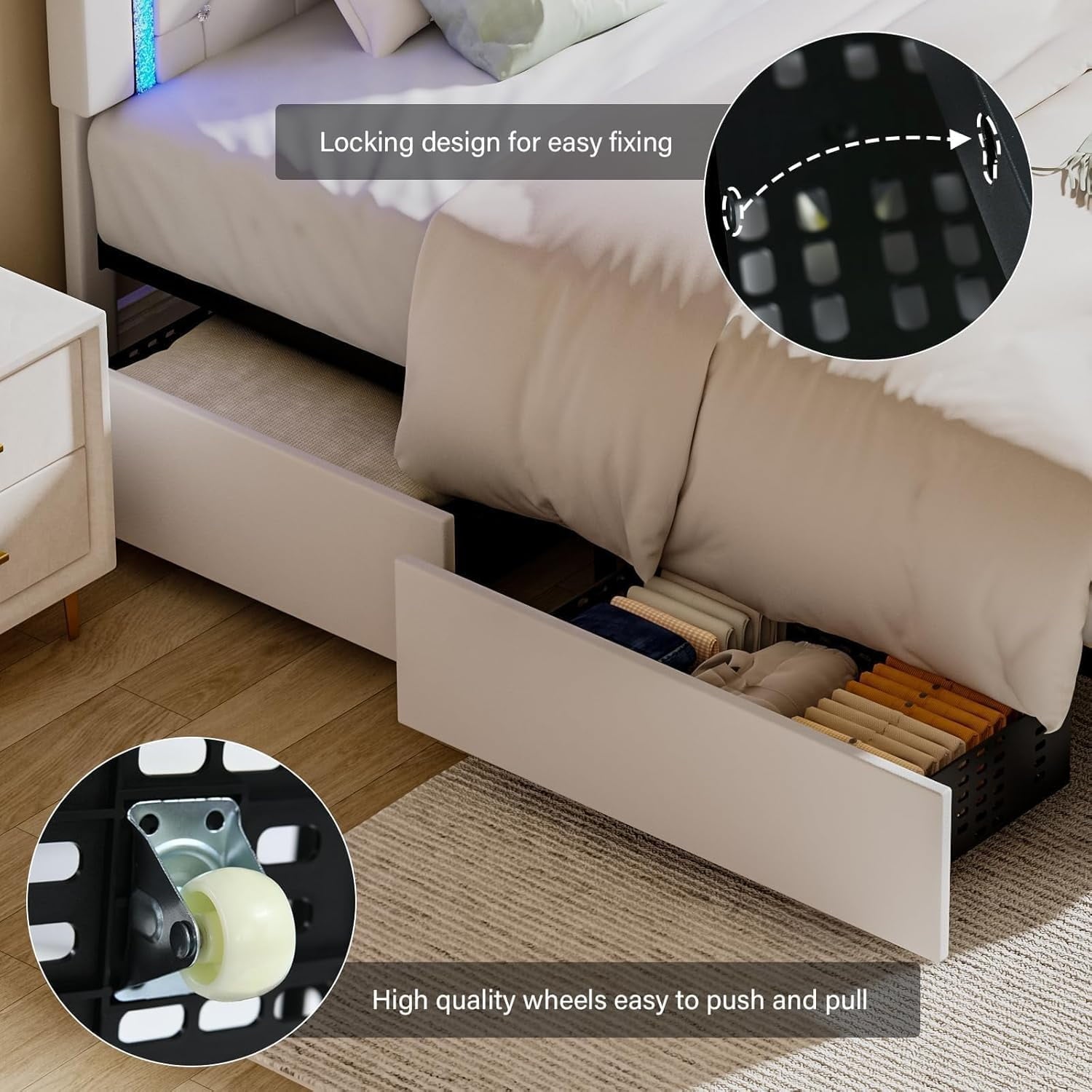 - Platform Bed with Storage Drawers ------ The storage drawers on the sides of the bed frame are equipped with wheels for easy pull-out and pull-in operation and may be used to store toys, clothing, quilts, and other miscellaneous items to keep the room orderly.