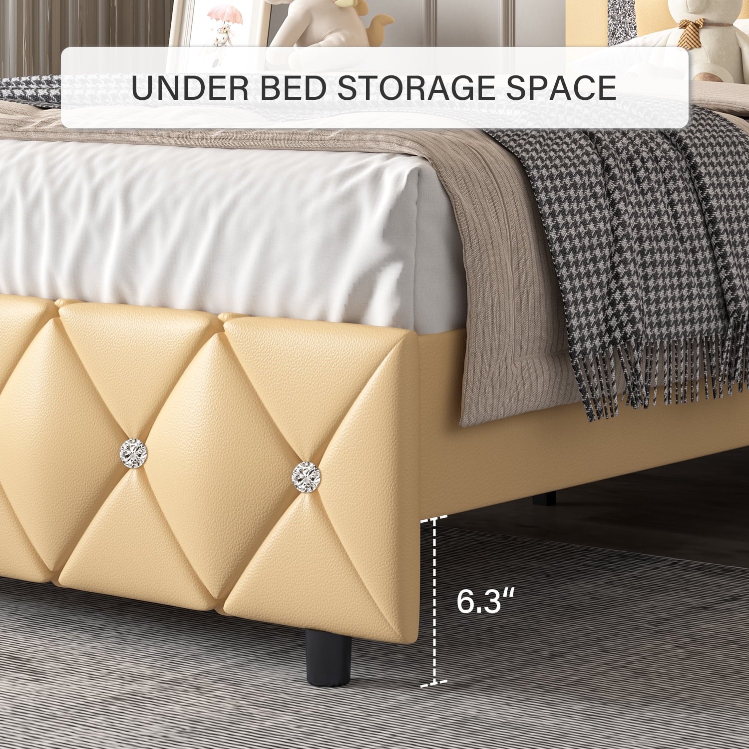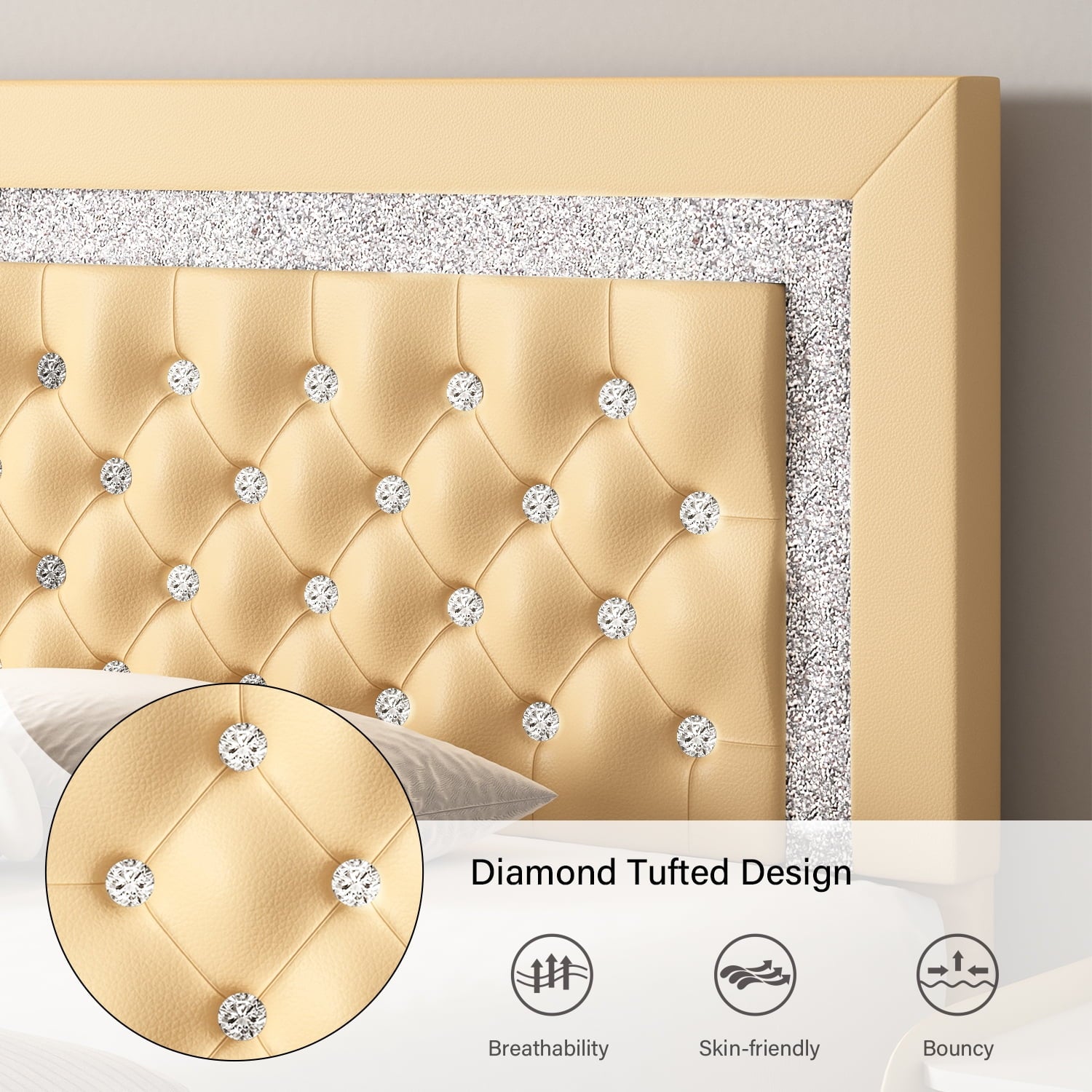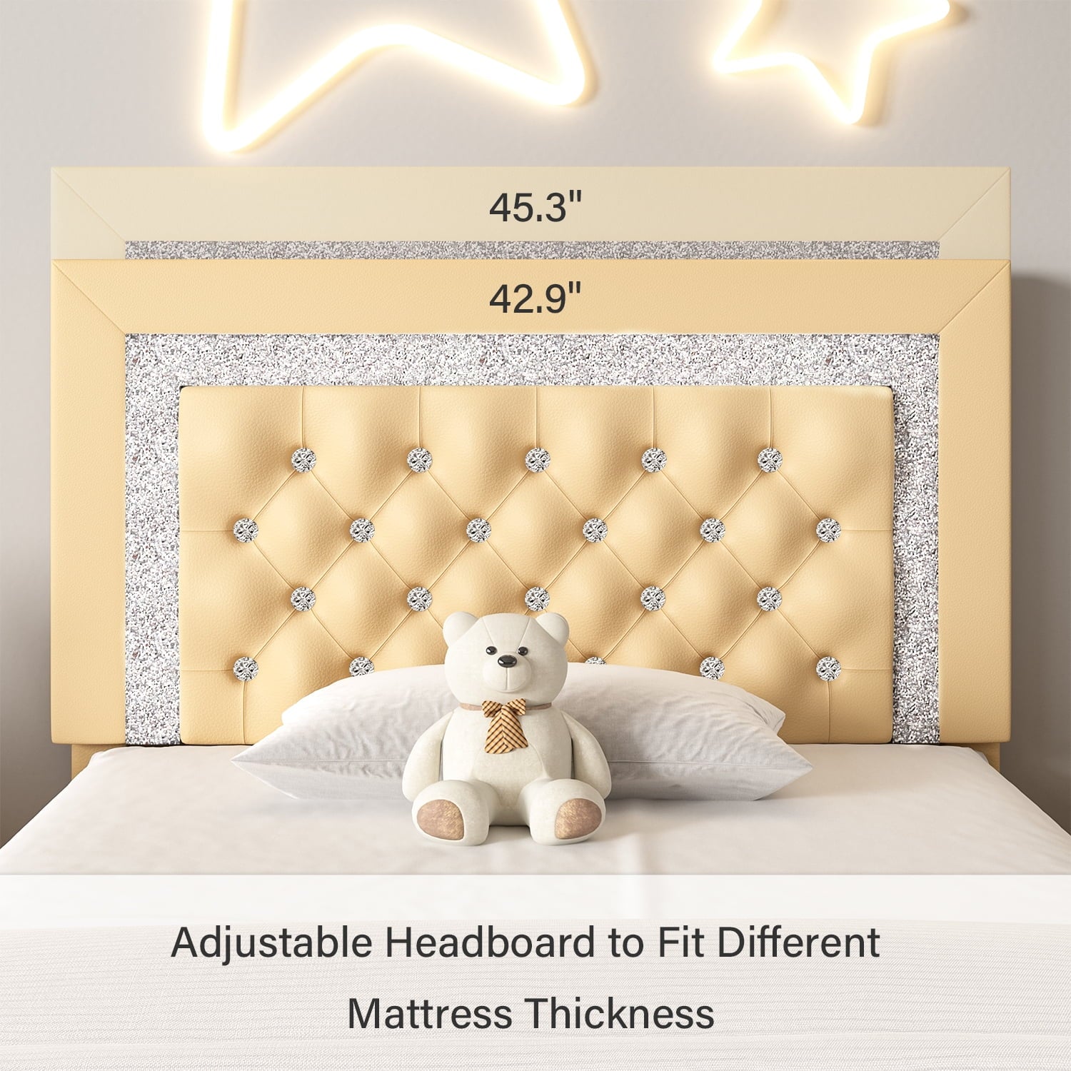 - Diamond Headboard----- An adjustable diamond headboard is offered for this twin bed frame, which can accommodate any mattress height. The sparkling diamonds of the bed will encircle you and bring a luxurious feeling. With its crystal tufted upholstery and faux leather wrapping, this modern twin size bed frame is elegant and comfortable. It can harmonize perfectly with any bedroom design.
