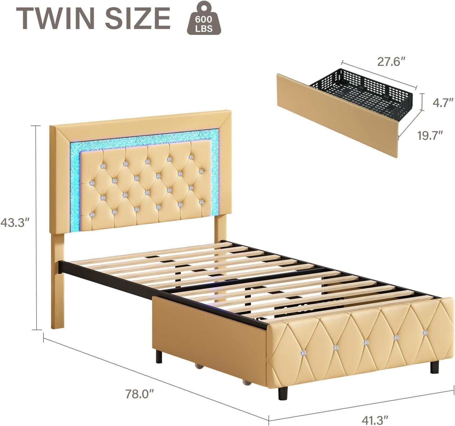 4 EVER WINNER Twin Size LED Bed Frame with 2 drawers, Twin Bed Frame with LED Light and Diamond Headboard, Modern Upholstered Bed for Kids, Yellow