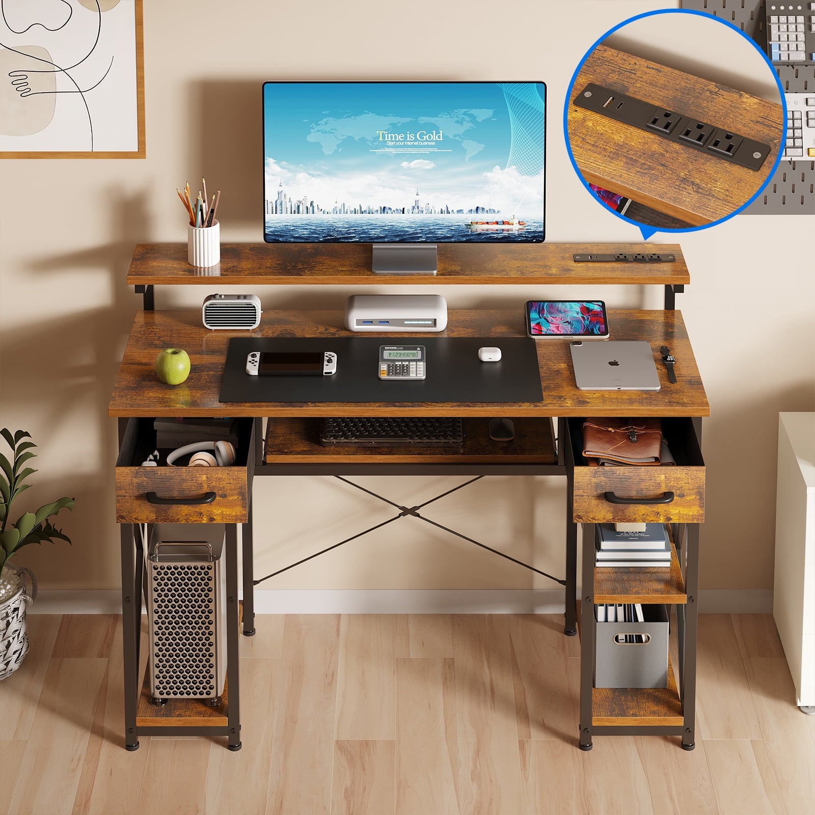 This modern computer desk is perfect for professionals working from home, students studying late into the night, and gamers looking for an efficient setup. It includes a built-in power outlet with 3 outlets, 1 USB port, and 1 Type-C port for convenient charging of multiple devices. The slide-out keyboard tray (23'' X 11'') provides extra space for a tidy workspace. Two fabric drawers keep LETTER/A4 SIZE FILES organized and dust-free. The upper shelf offers 3 height options (4.1", 5.3", 6.5") for comfortable monitor placement, reducing neck pain during long hours of use. Additionally, the under-desk open shelves offer ample storage for a computer tower or small items, making it ideal for various home office setups.