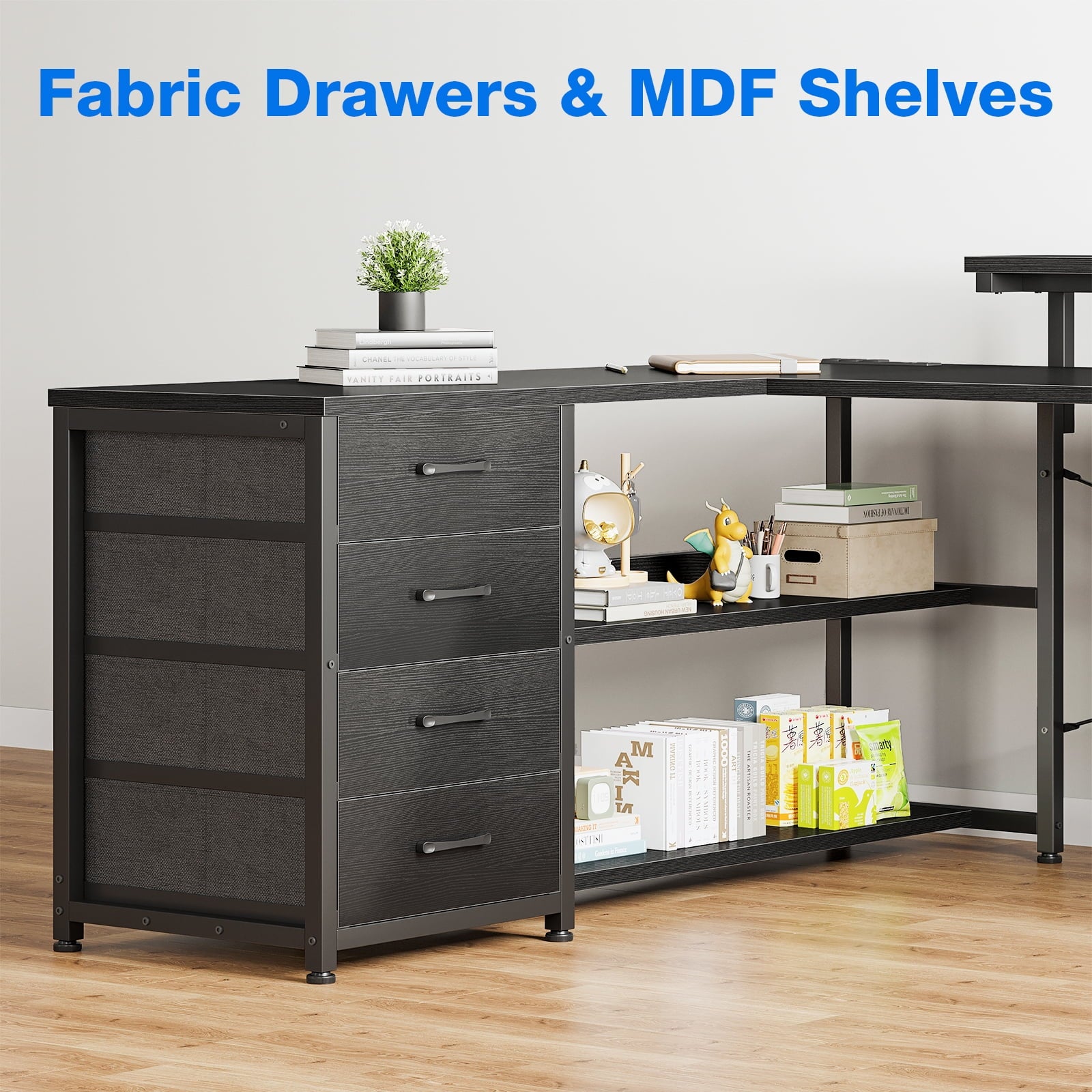 Lots of leg room. The desktop on the side can be used for printers and so on. 4 fabric drawers help store files, stationery and other privacy items. Shelves under the desk allow you to store CPU, unlimited office supplies and documents. Super practical design!