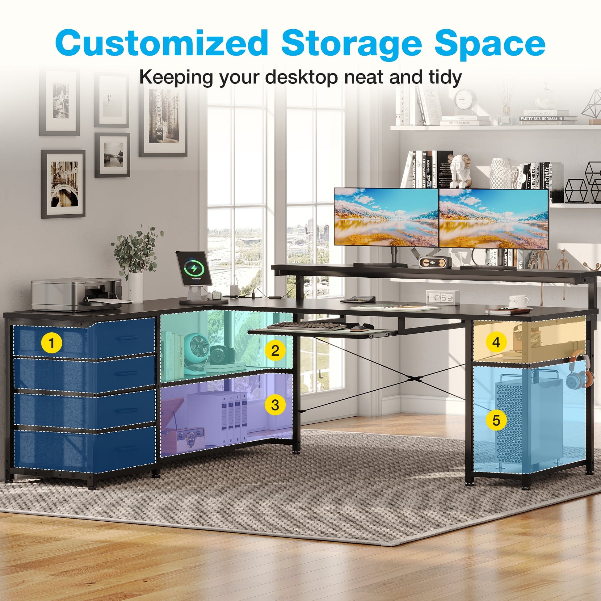 Lots of leg room. The desktop on the side can be used for printers and so on. 4 fabric drawers help store files, stationery and other private items. Shelves under the desk allow you to store CPU, unlimited office supplies and documents. Super practical design!