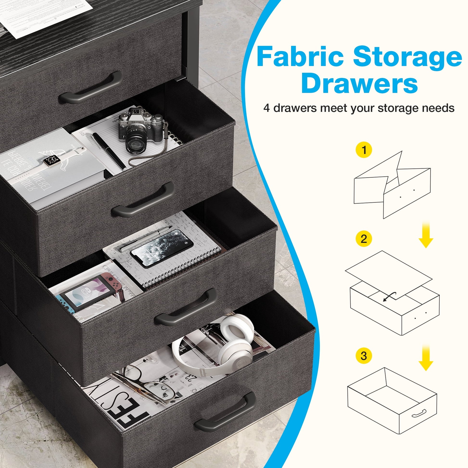 - 4 Fabric Storage Drawers & 4 Storage Shelves