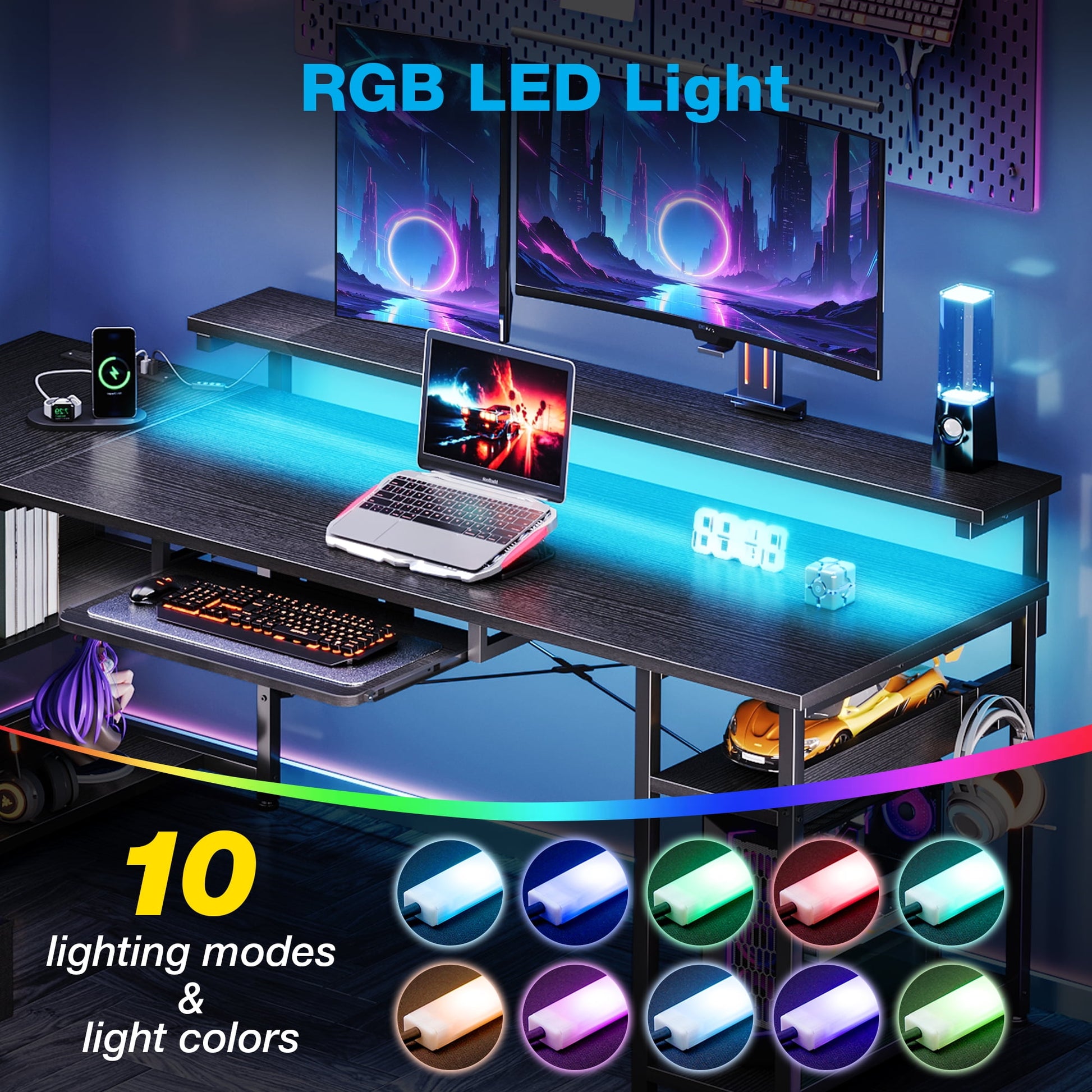 Available in 10 colors and 10 modes for your choice. Set the color with the switch as your personal preference,enjoy yourself in the gaming ambiance. And the L-shape desk is configured either on the right or left side.