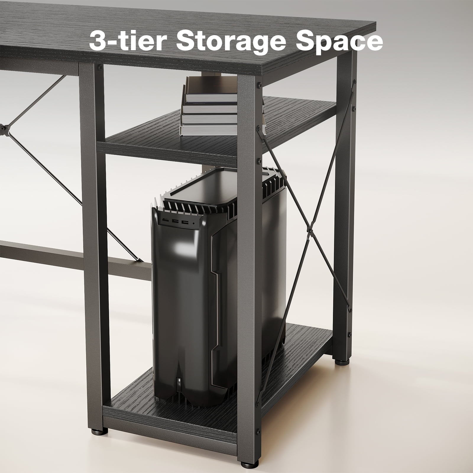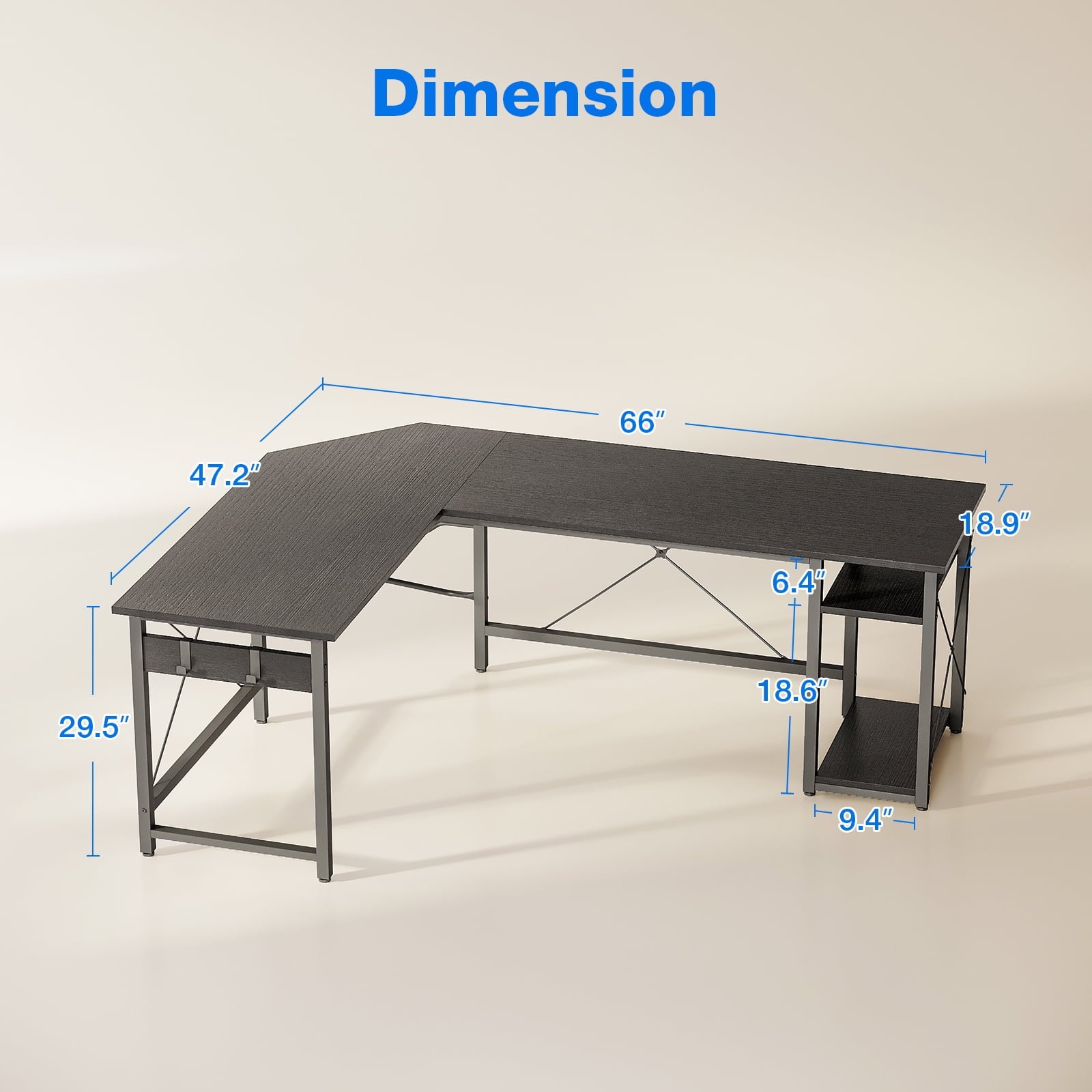 L Shaped Design with Storage Shelf: Made of a sleek Wide desktop with a storage shelf equipped. You will have plenty of surface space for writing, computer work, and other home office activities. A 2-layer shelf gives you extra storage space, and plenty of space for books, files, or other items. The bottom shelf is 20.2\