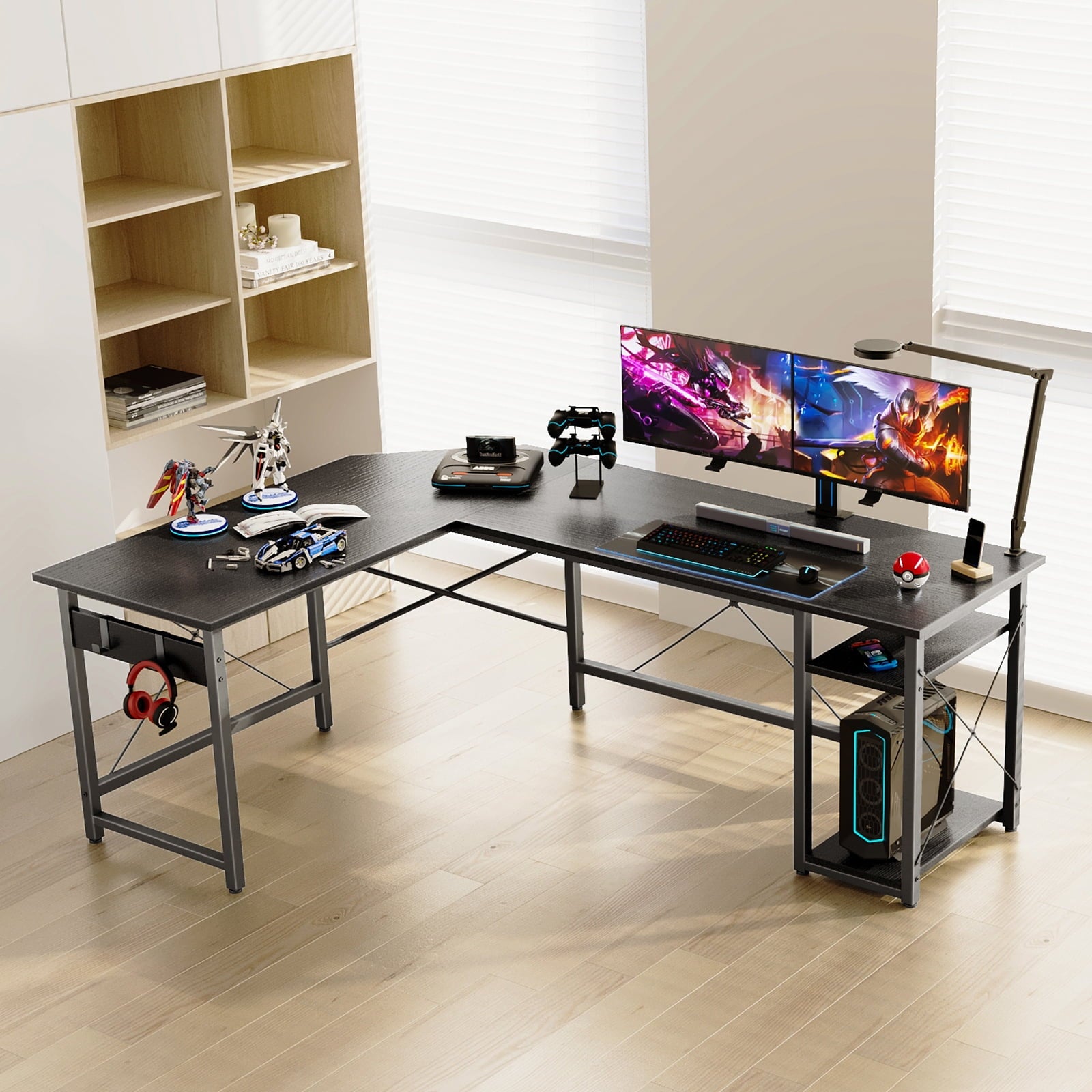 66 inch L Shaped Computer Desk with Storage Shelves, Corner Gaming Desk, Sturdy Writing Desk Workstation, Modern Wooden Desk Office Desk, Wood & Metal, Black