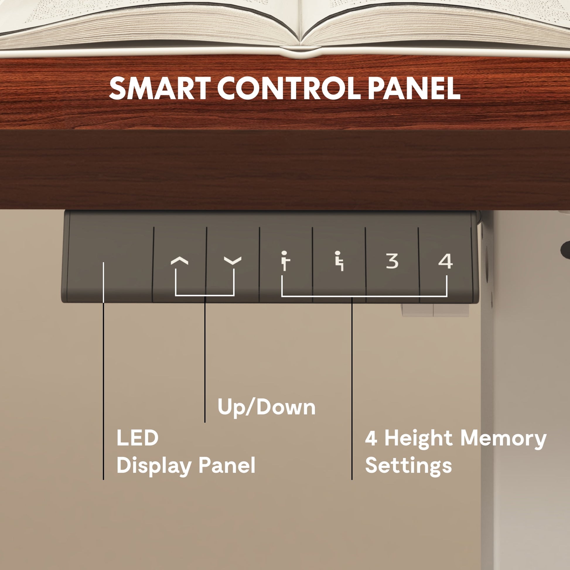 - Equipped with 6 buttons, including up and down adjustment, standing and sitting position presets, and two customizable height memory settings for effortless operation.