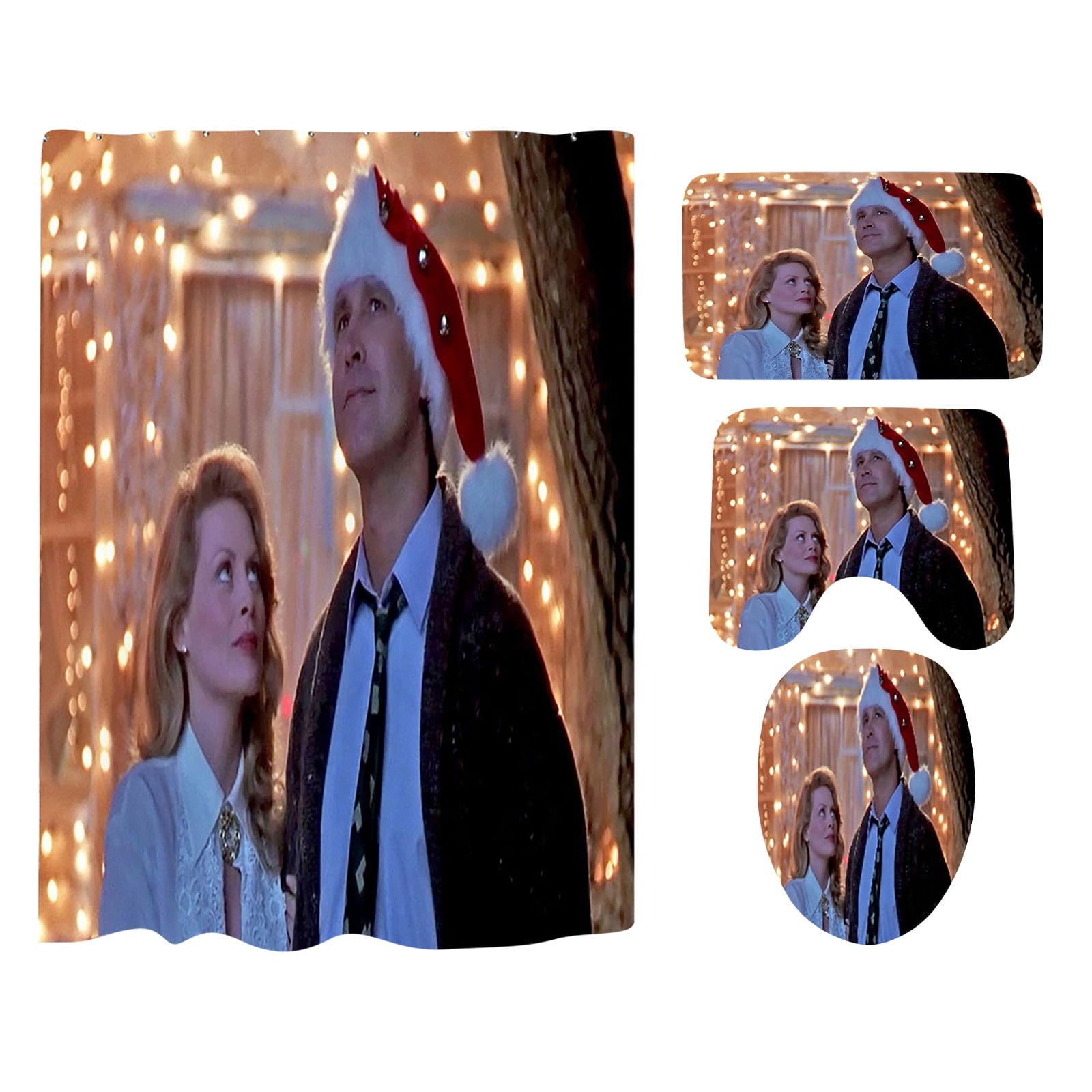 Crazy Christmas Vacation Christmas Shower Curtain Bathroom Anti-slip Carpet Rug Toilet Cover Mat Set Features: ?? --- Luxurious and cushiony, this Christmas bathroom rugs sets is constructed of Flannel surface and natural latex non-slip bottom, that's incredibly soft ?? --- Stylish Xmas pattern printed santa claus, Christmas tree, elk etc, Creative funny Christmas elements pattern decorations give your family a Christmas atmosphere ?? --- Wonderful Xmas bathroom sets, also can be separately to use in the entrance, under the table and in bedroom, kitchen, bed, car seat, sofa cushion, and so on. Add a festive life and personality to any space ?? --- Xmas shower curtains bathroom sets is easy to clean, can be directly wa by washing machine or hands, not and fade, the back avoid to direct sunlight ?? --- Xmas shower curtain, non-slip pedestal rug, lid toilet cover and bath mat, comes with 10 curtain hooks, simply apply to wherever you want and they won't damage your paint or leave any mess size:as shown Include: 1x shower curtain 1x floor mat 1x bathroom mat 1x toilet mat