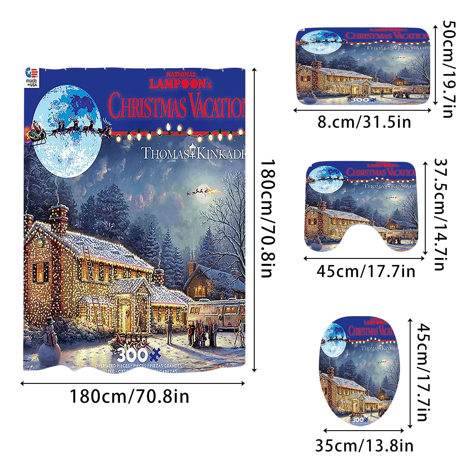 Crazy Christmas Vacation Christmas Shower Curtain Bathroom Anti-slip Carpet Rug Toilet Cover Mat Set Features: ?? --- Luxurious and cushiony, this Christmas bathroom rugs sets is constructed of Flannel surface and natural latex non-slip bottom, that's incredibly soft ?? --- Stylish Xmas pattern printed santa claus, Christmas tree, elk etc, Creative funny Christmas elements pattern decorations give your family a Christmas atmosphere ?? --- Wonderful Xmas bathroom sets, also can be separately to use in the entrance, under the table and in bedroom, kitchen, bed, car seat, sofa cushion, and so on. Add a festive life and personality to any space ?? --- Xmas shower curtains bathroom sets is easy to clean, can be directly wa by washing machine or hands, not and fade, the back avoid to direct sunlight ?? --- Xmas shower curtain, non-slip pedestal rug, lid toilet cover and bath mat, comes with 10 curtain hooks, simply apply to wherever you want and they won't damage your paint or leave any mess size:as shown Include: 1x shower curtain 1x floor mat 1x bathroom mat 1x toilet mat