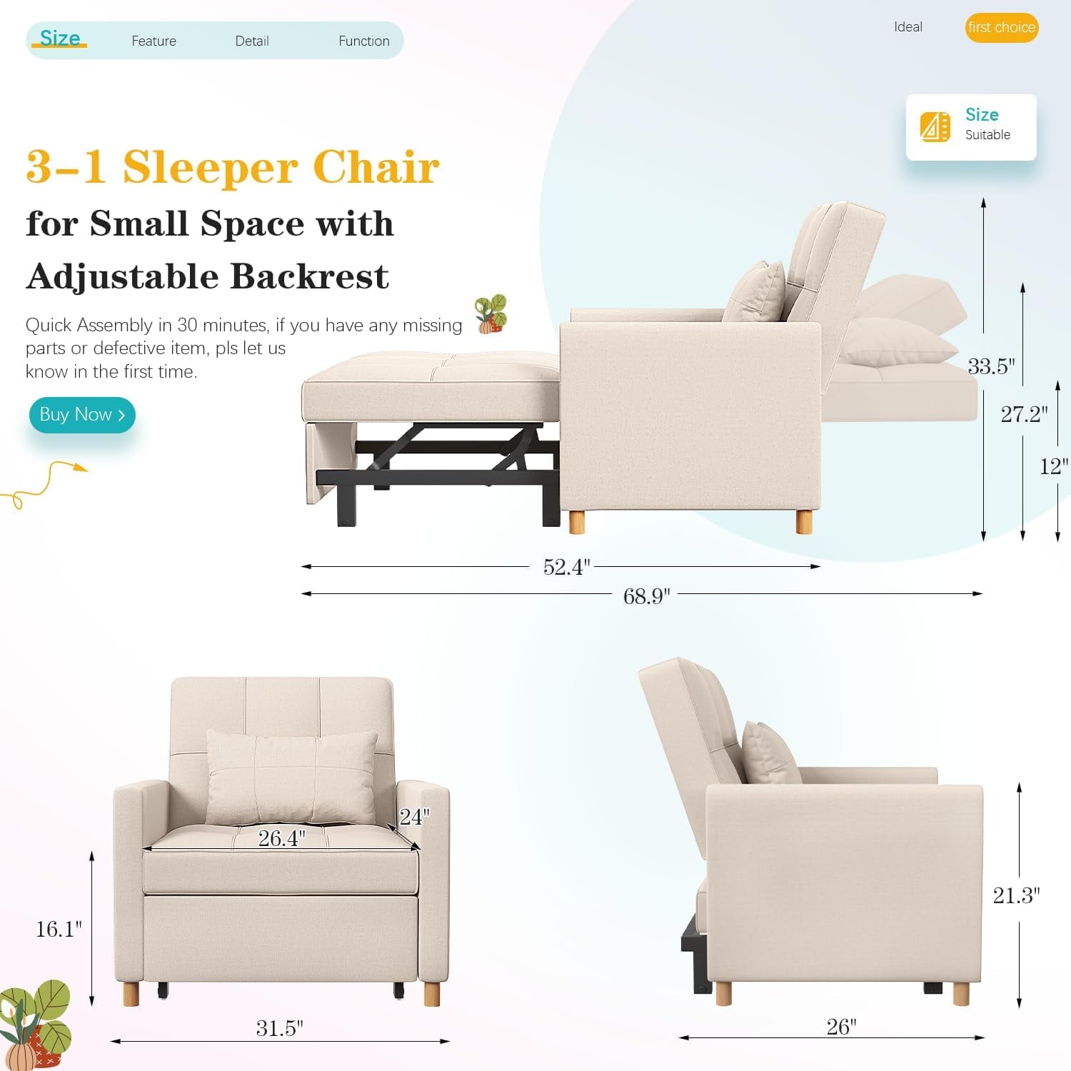 AECOJOY Sleeper Sofa Chair, 3 in 1 Sleeper Chairs for Adults, Fold Out Chair Bed with Pillow and Convertible Backrest, Multi-Functional Reading Chair for Small Space (Cream Beige)