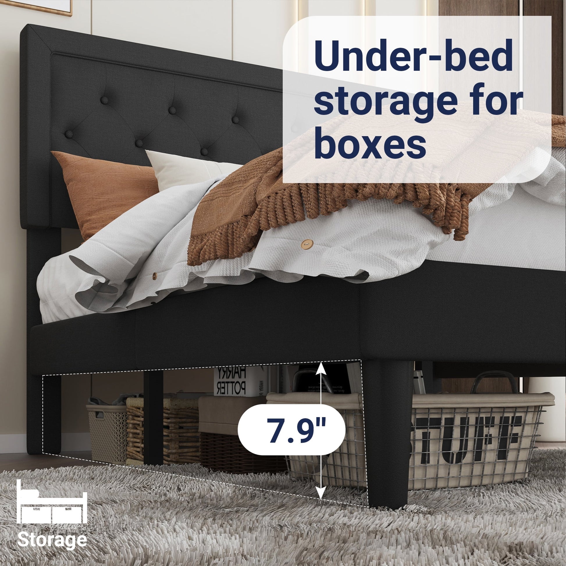 - Stylish and Comfortable: With Upholstered linen and tufted button headboard, this classic silhouette bed frame can match a variety of bedroom styles perfectly. Thick and dense foam padding gives you a comfortable touch.