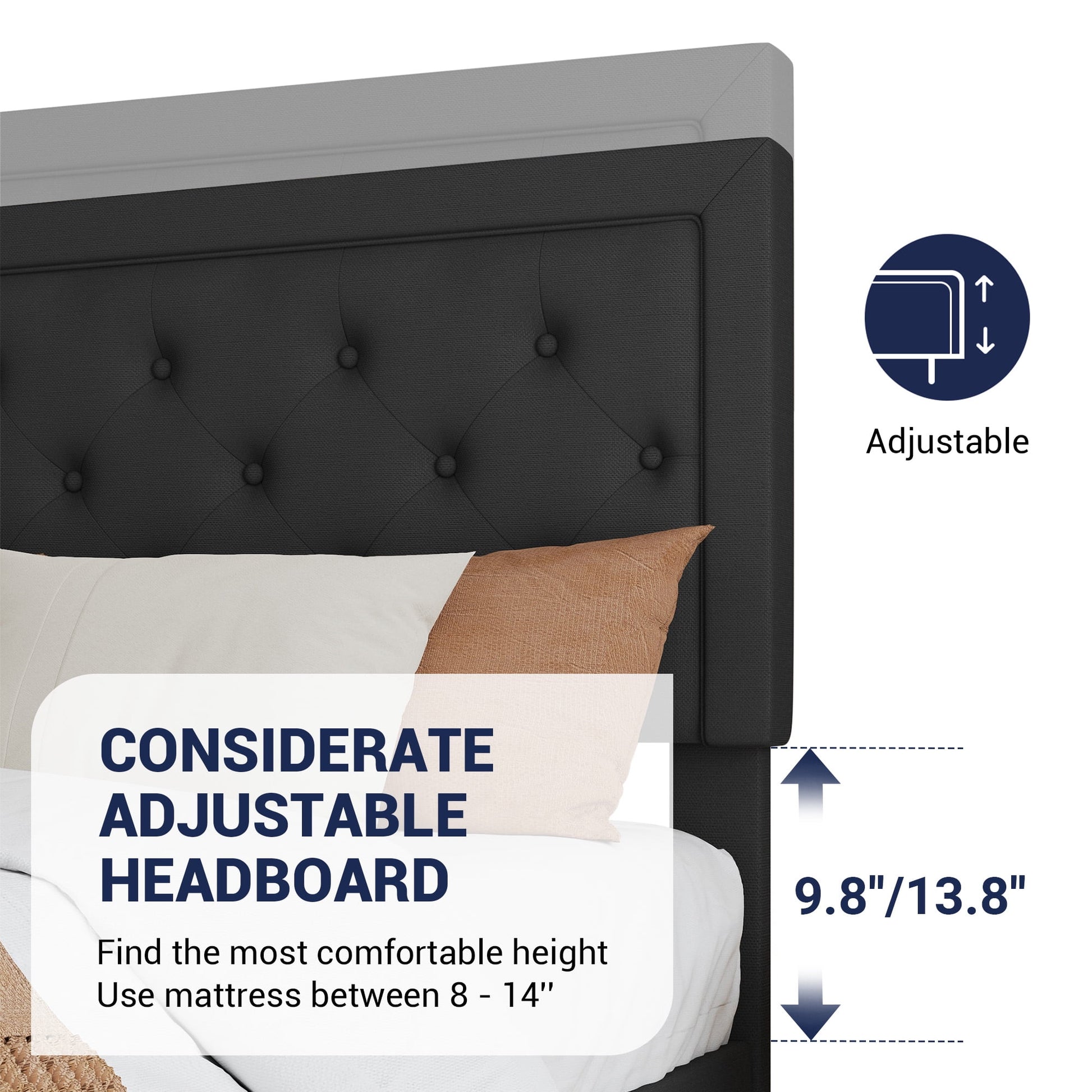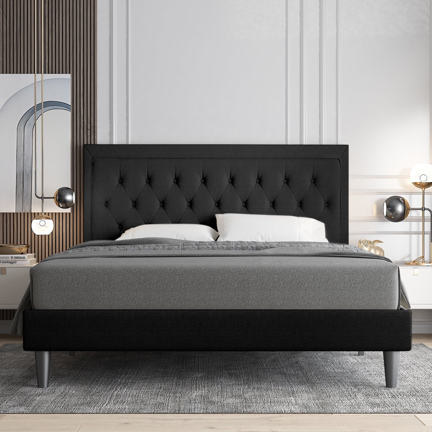 - Stylish and Comfortable: With Upholstered linen and tufted button headboard, this classic silhouette bed frame can match a variety of bedroom styles perfectly. Thick and dense foam padding gives you a comfortable touch.