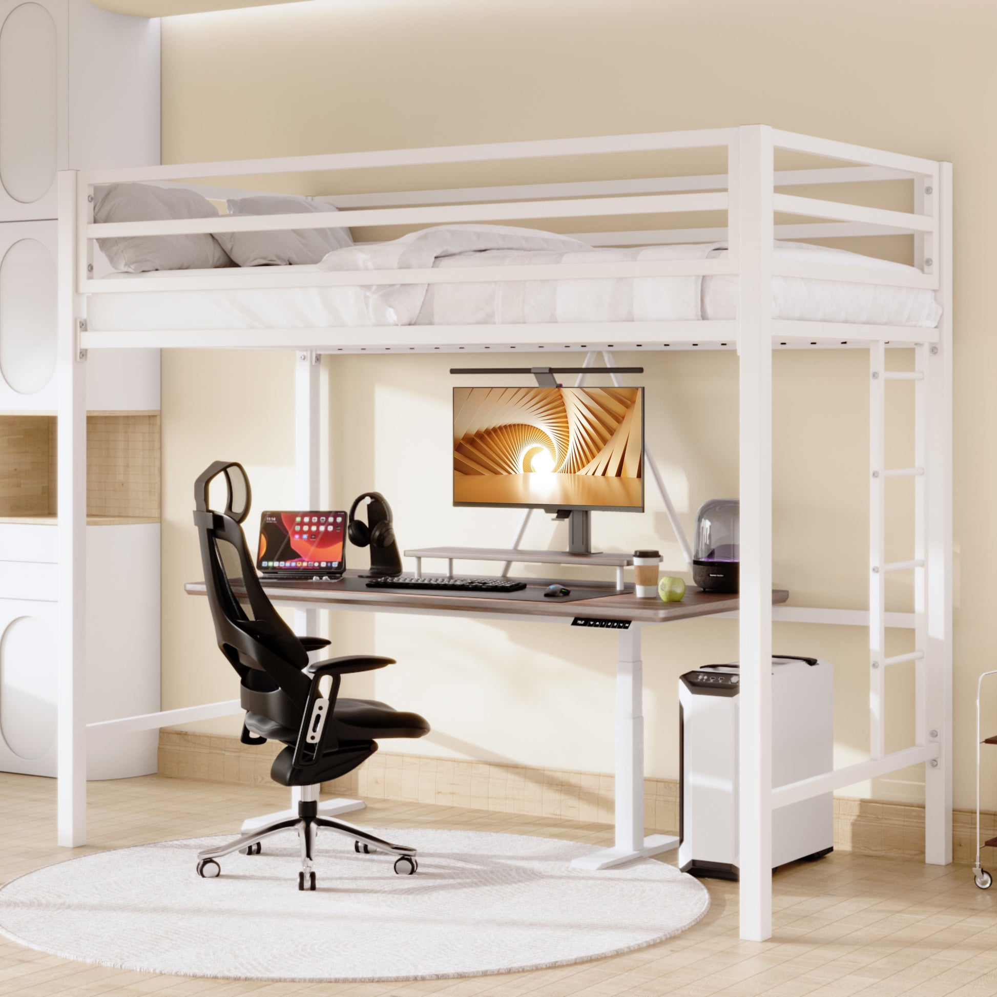 Loft style design makes full use of your space and makes your room look less crowded. Offered in Matte Black, Pure White and Apple Green, any color scheme with fresh style. All metal structure, making the whole bed has excellent load-bearing capacity and the angled stairs are safer for you to get in and out the bed.