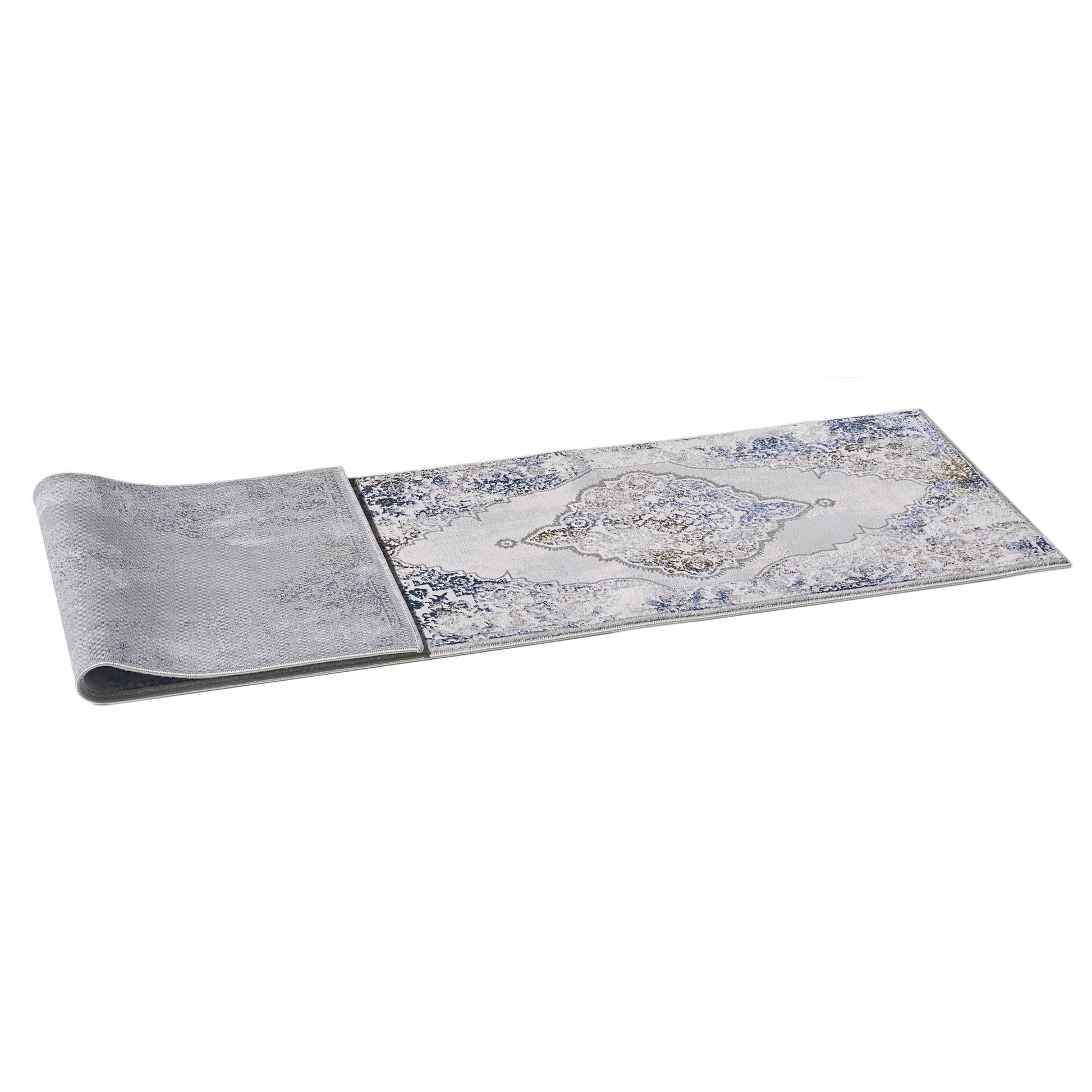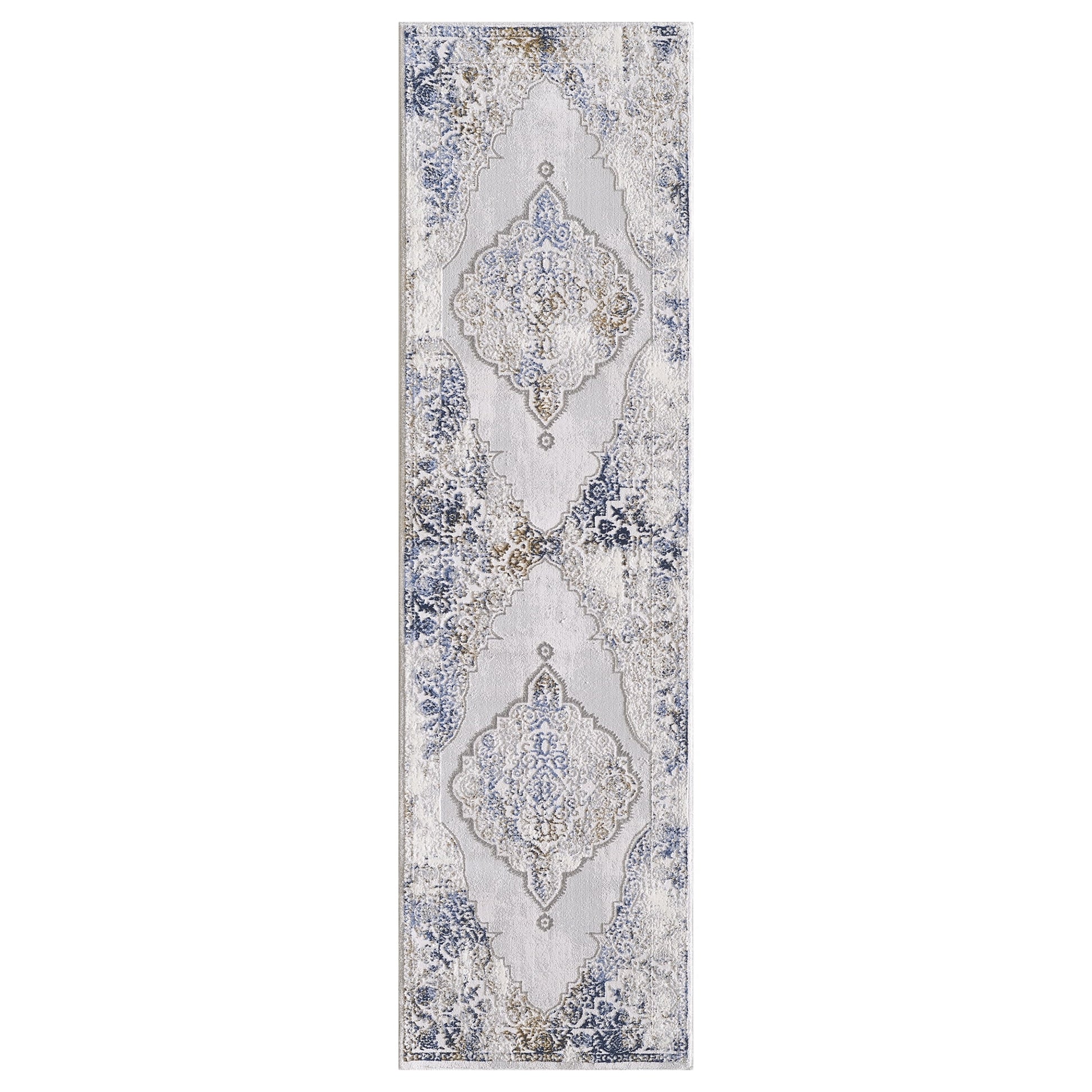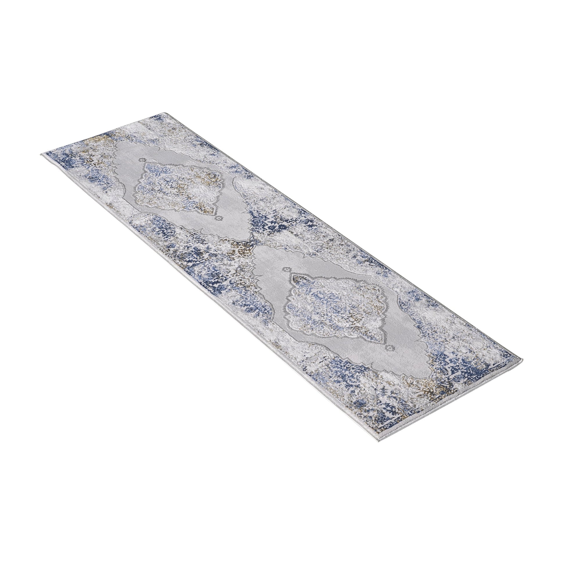 Allstar Rugs 2' 0in x 6' 11in Gainsboro Grey Traditional Persian Themed Polyester Runner with a Blue Bijar Design and Gold Accents. Machine-Made in Turkey.