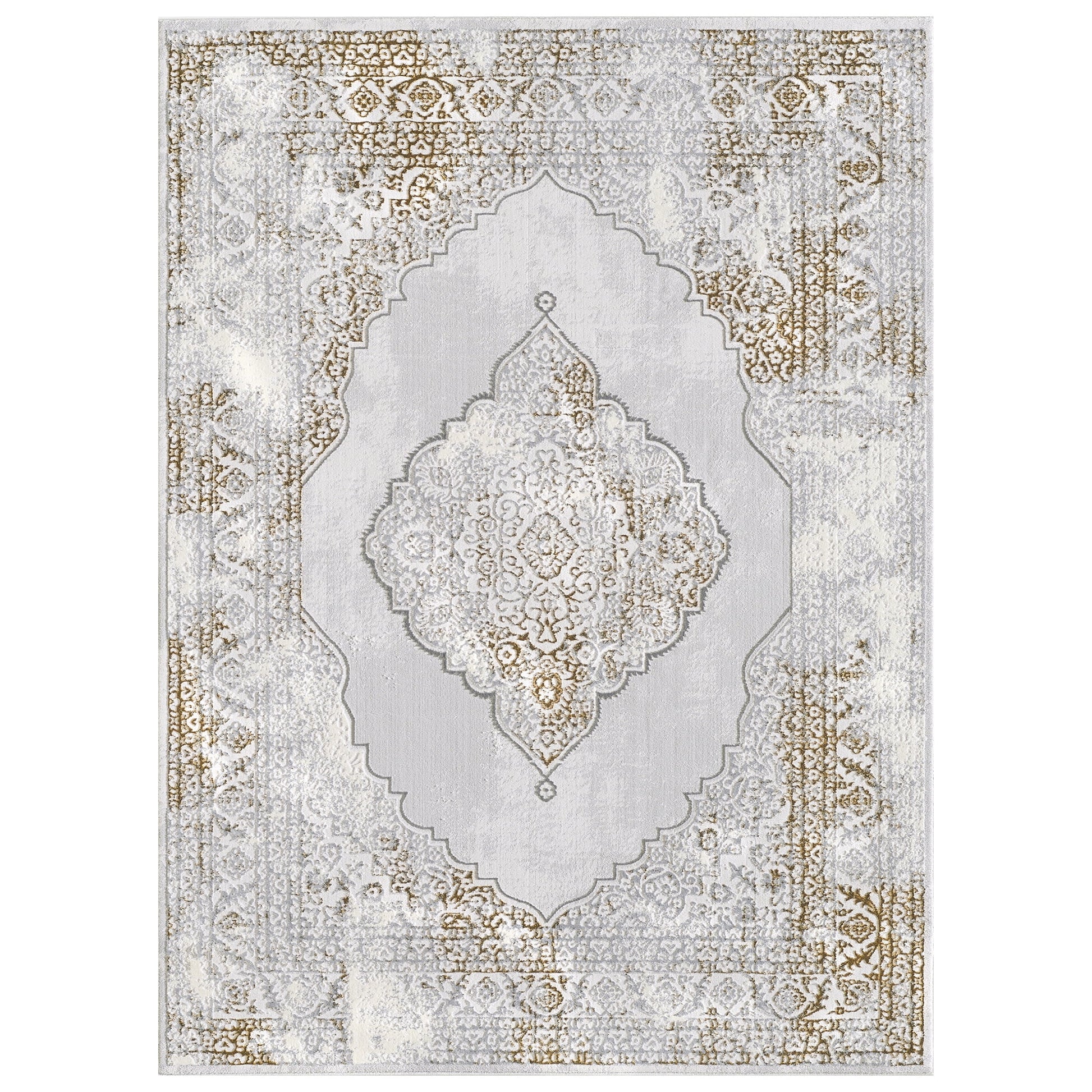 Allstar Rugs 7' 9in x 10' 0in Gainsboro Grey Traditional Persian Themed Polyester Area Rug with a Gold Bijar Design and Ivory Accents. Machine-Made in Turkey.