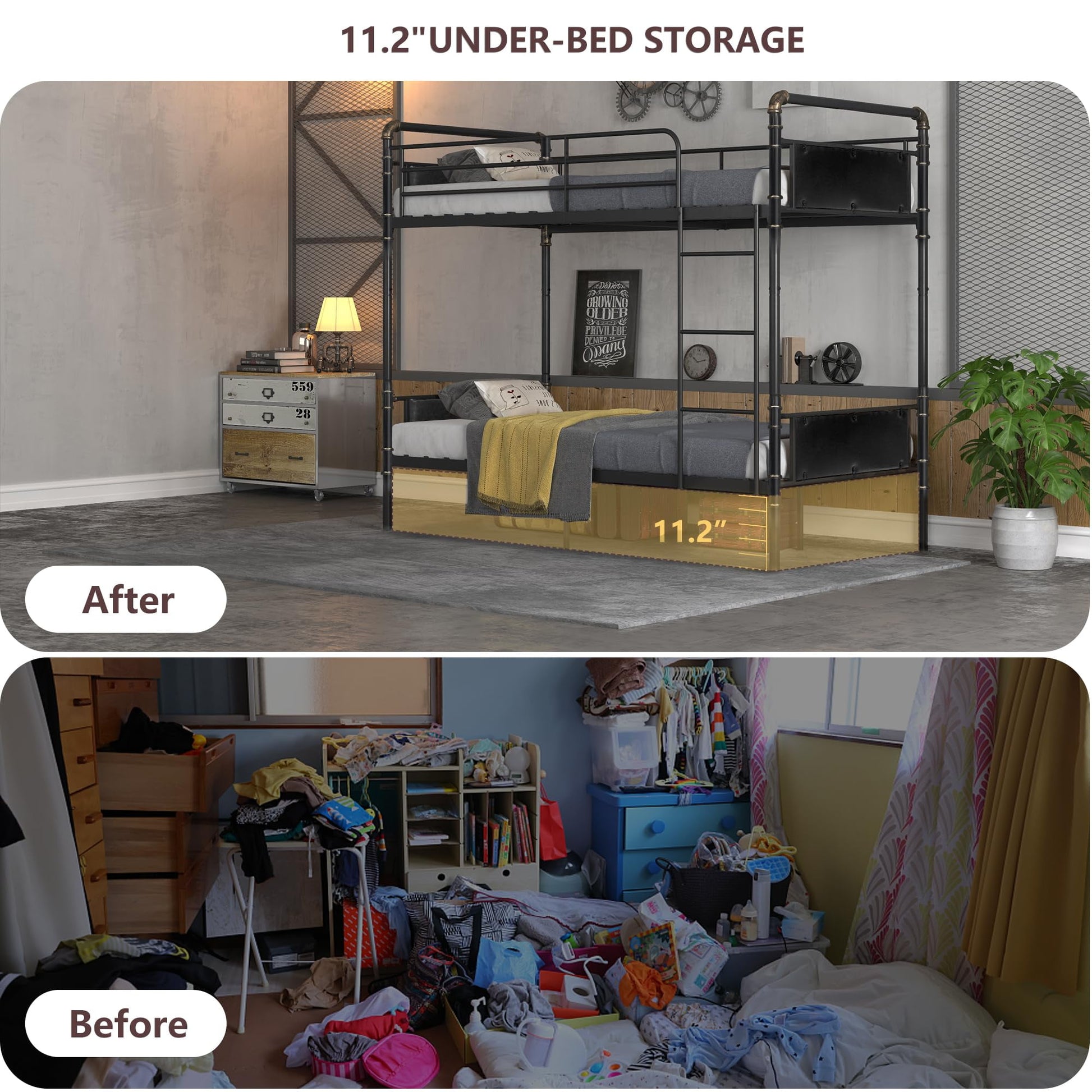 - Reversible Ladder available for both sides, 16.5" high safety guardrails to allows sleep safely and sleep tight over the night, 11.2" Under-Bed Storage to expend your bedroom storage for your daily uses