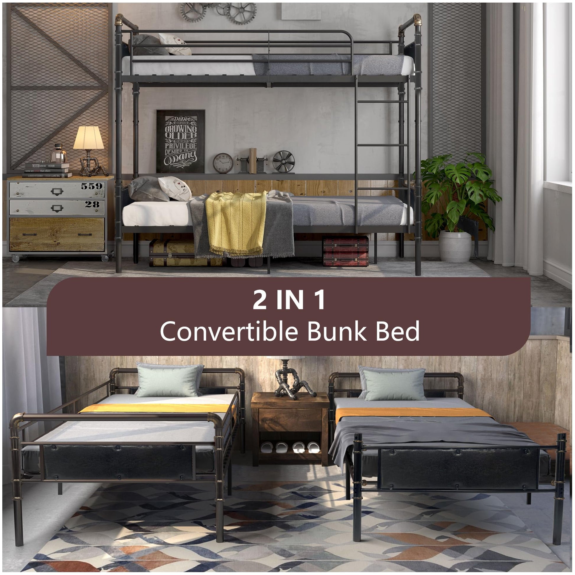 - Twin over Twin Bunk bed or 2 twin individual beds at will, Convertible design to make bed frame can be used as bunk bed for space-saving or 2 twin size beds for kids without bothering each other, perfectly fit in any kids bedroom, guest room and school Dorms