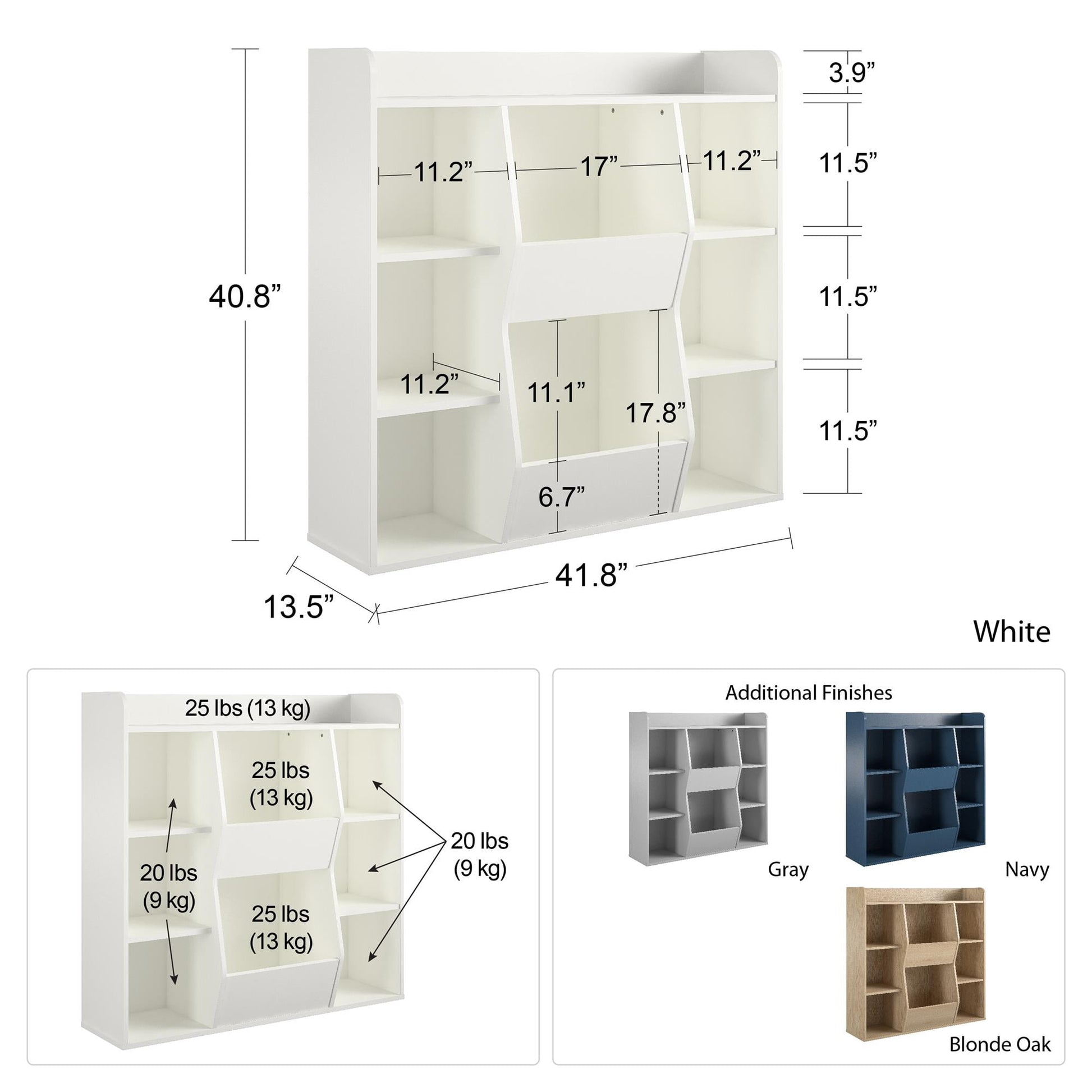 - The Toy Storage Bookcase ships flat to your door and 2 adults are recommended to assemble. The top shelf and middle 2 cubbies can each hold up to 25 lbs. The 6 side cubbies (3 on the left, 3 on the right) will hold up to 20 lbs. each. Assembled dimensions: 41.65"W x 13.5"D x 40.8"H