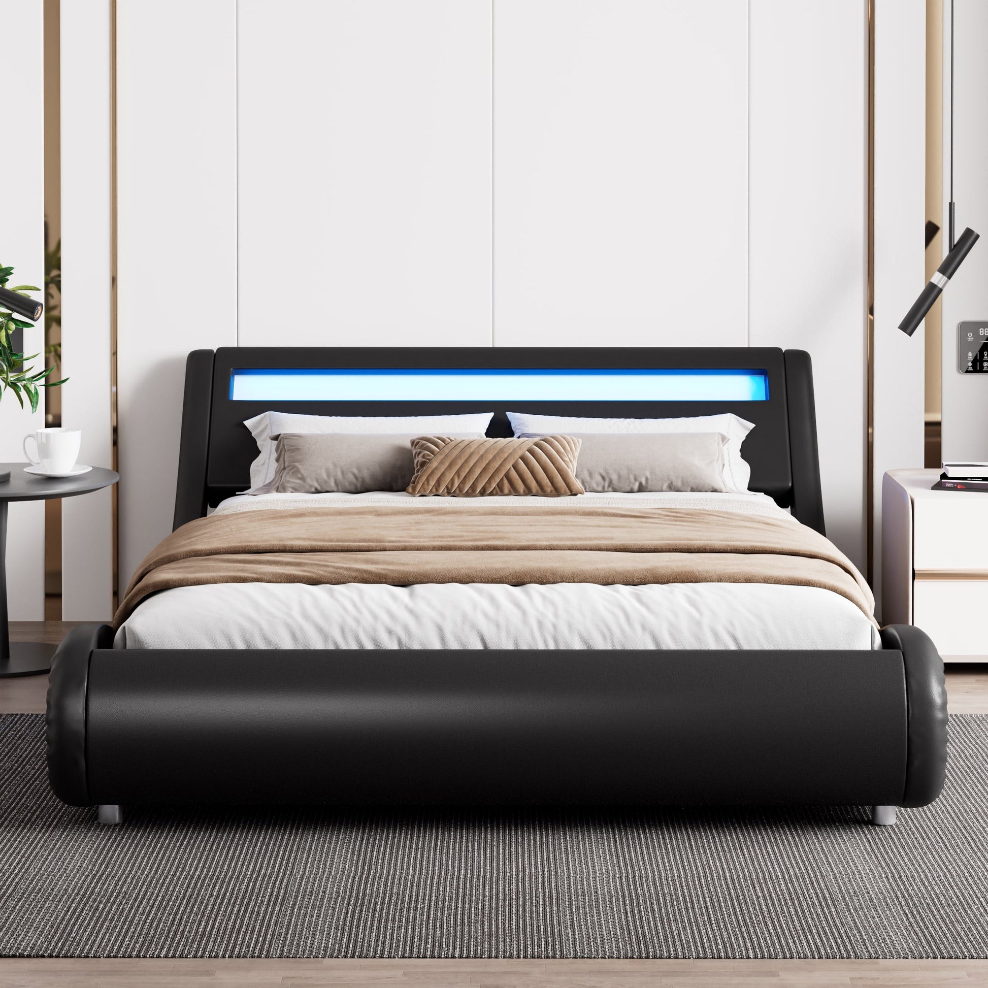 The modern industrial design of Amolife's bed frame with LED light stems from a little care for your life, aiming to bring a little light in the dark. This upholstered platform bed is completely wrapped in soft PU leather, providing ultimate comfort and a permanent appearance viewing experience. The equidistant slatted base can firmly and stably support any mattress without spring locks. Basic simple black and white tones, durable.