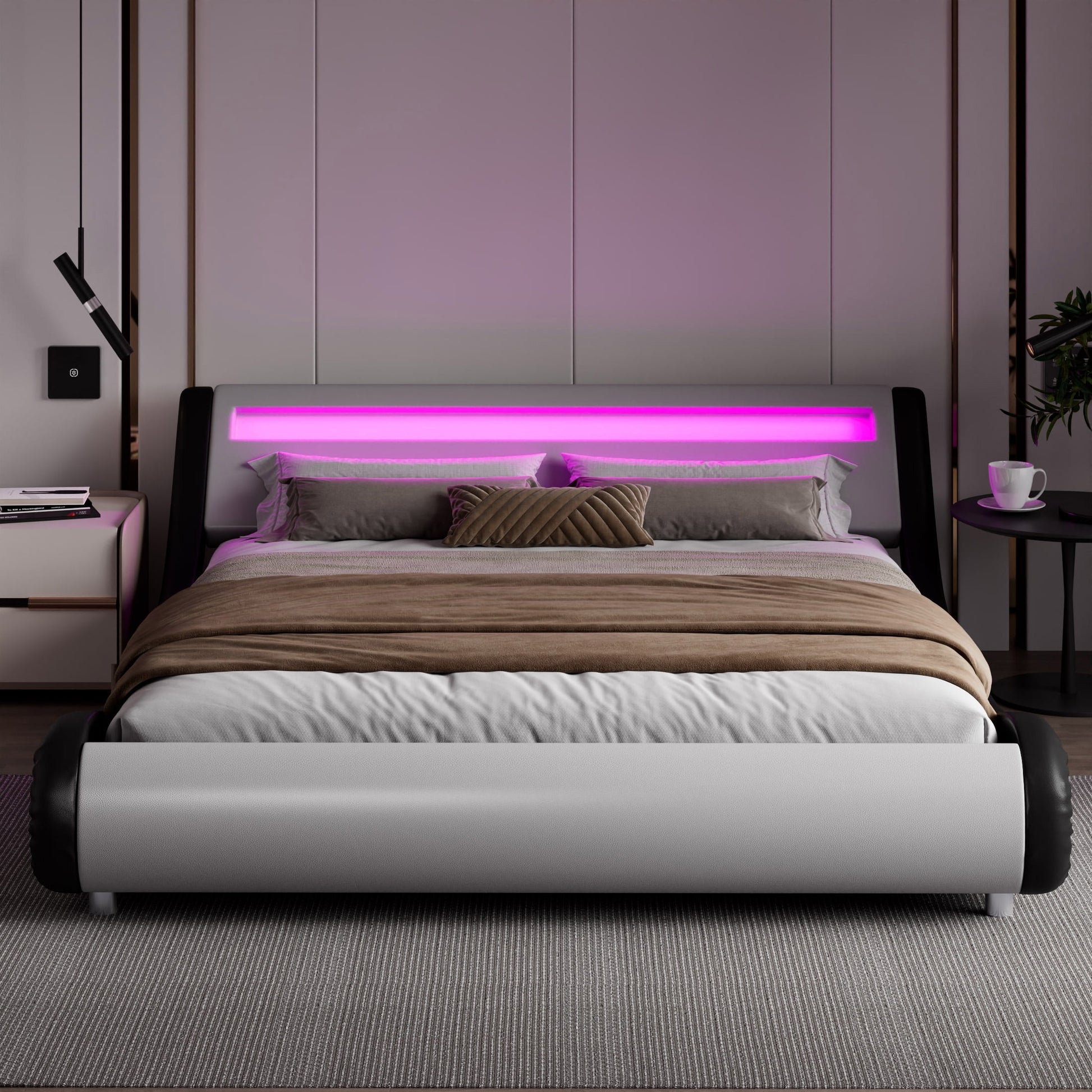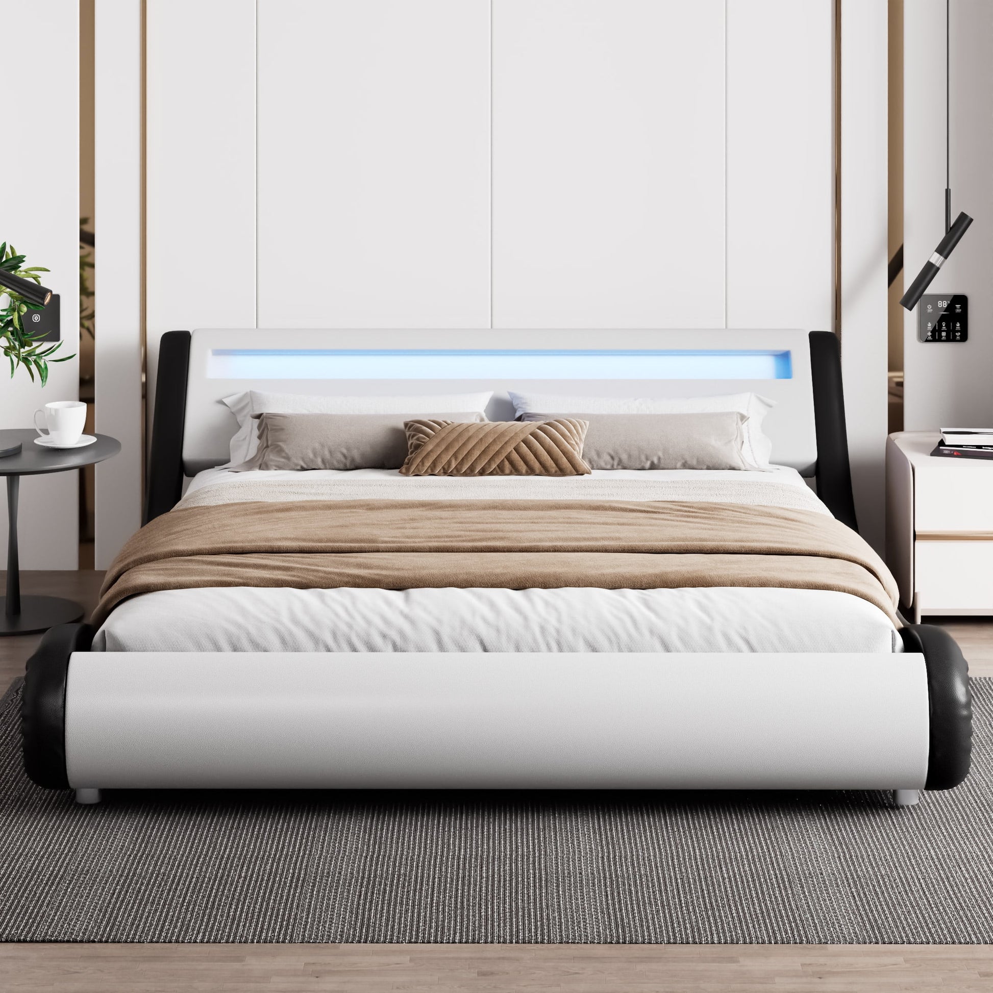 Amolife King Size Wave-like Curve Deluxe Upholstered Modern Bed Frame with LED Headboard, Black+White