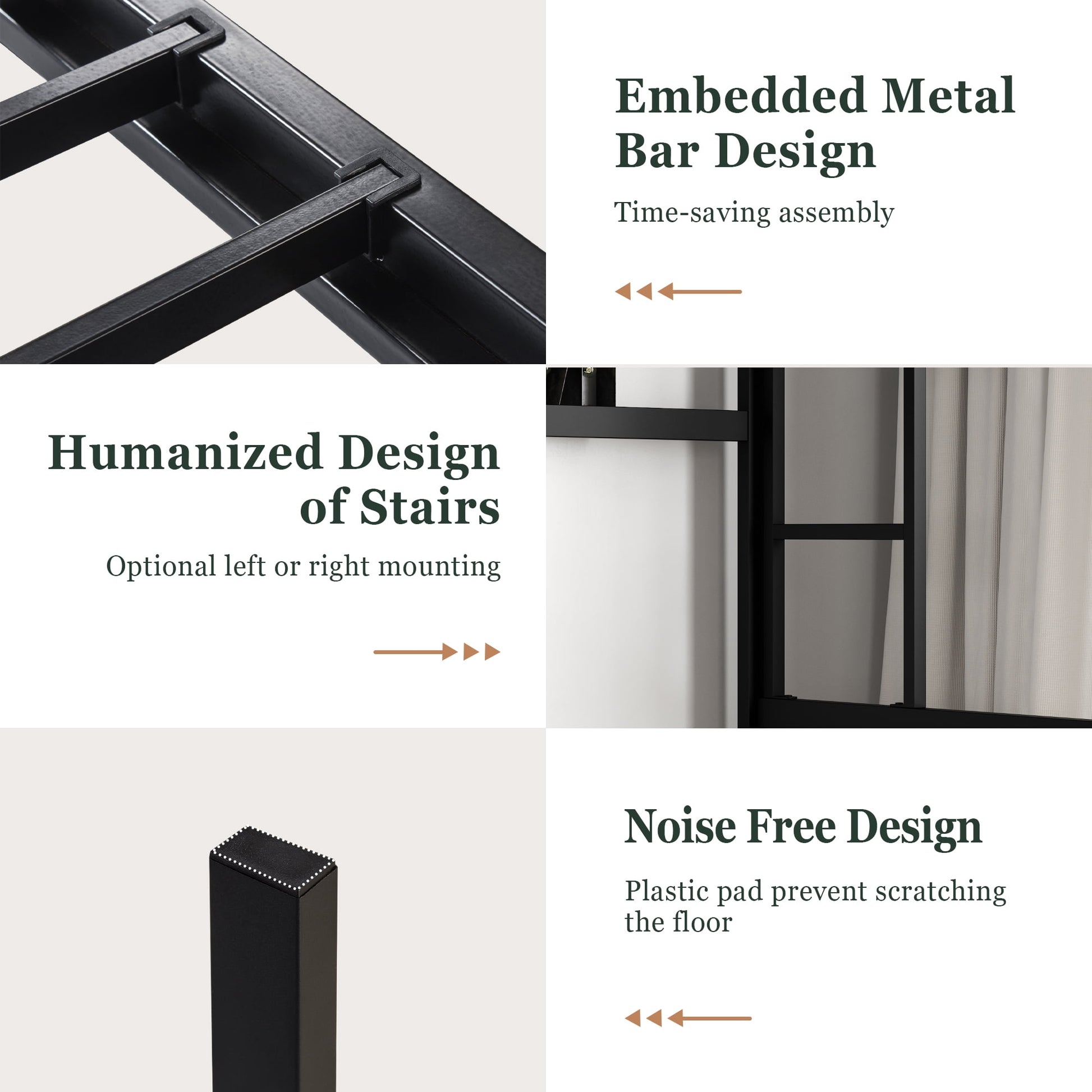 The plate of natural wood grain acts the role of pure iron material appears just right. Suitable for a variety of room styles. The sturdy plastic buckle stabilizes the iron bars while avoiding possible noise, giving you a quiet sleep experience. Sturdy plastic footpads are sturdy and wear-resistant, preventing the movement and sliding of the bed effectively. In addition, only the bed frame, not including the table.