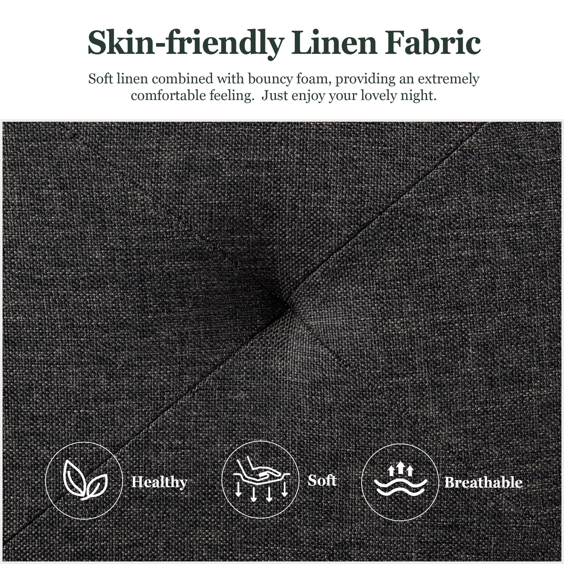 - Besides, with a simple platform design and a clean-lined headboard, the bed is perfect for a modern aesthetic. The headboard is upholstered with fabric, in a dark gray color, and filled with foam, offering you a comfortable feeling.