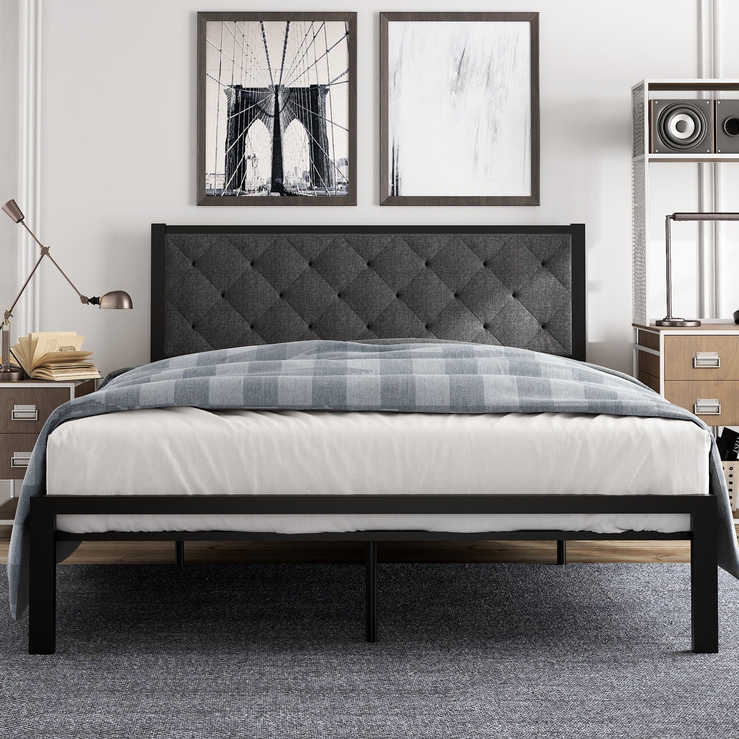 Amolife Queen Size Metal Bed Frame with Upholstered Headboard, Dark Grey