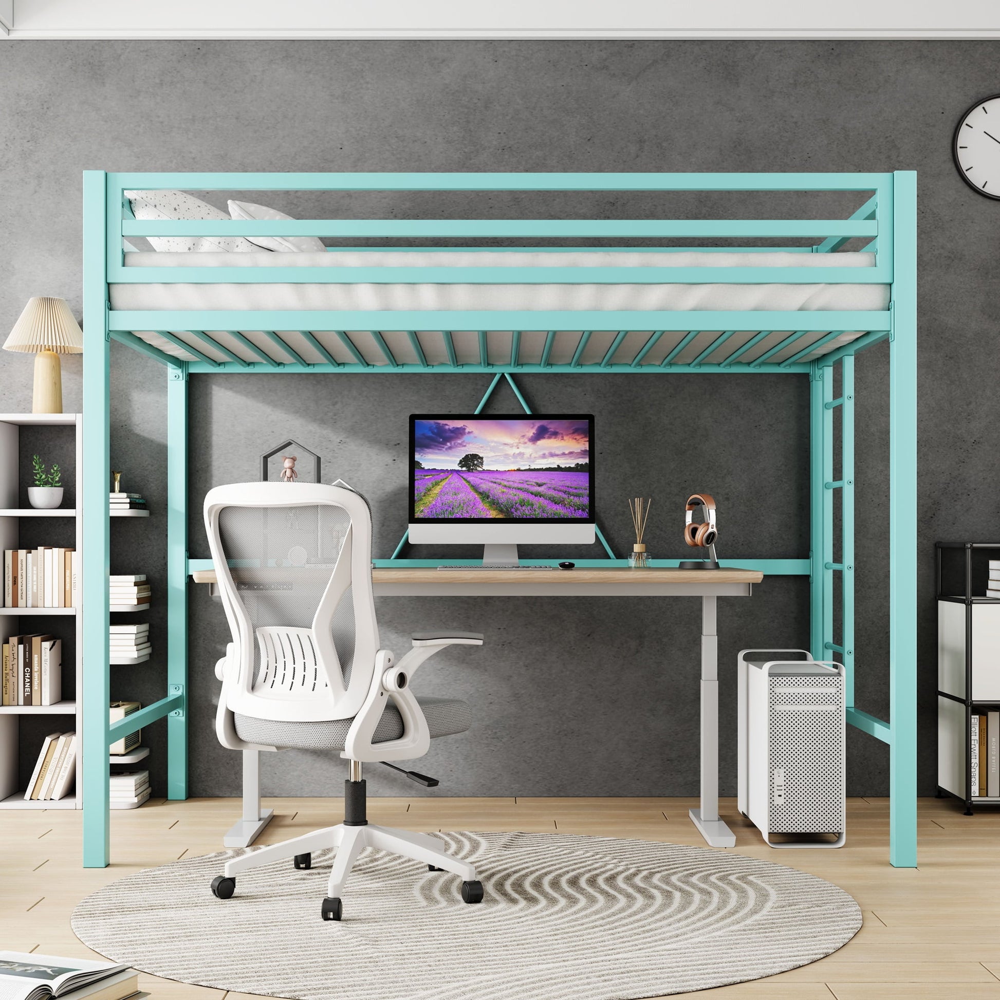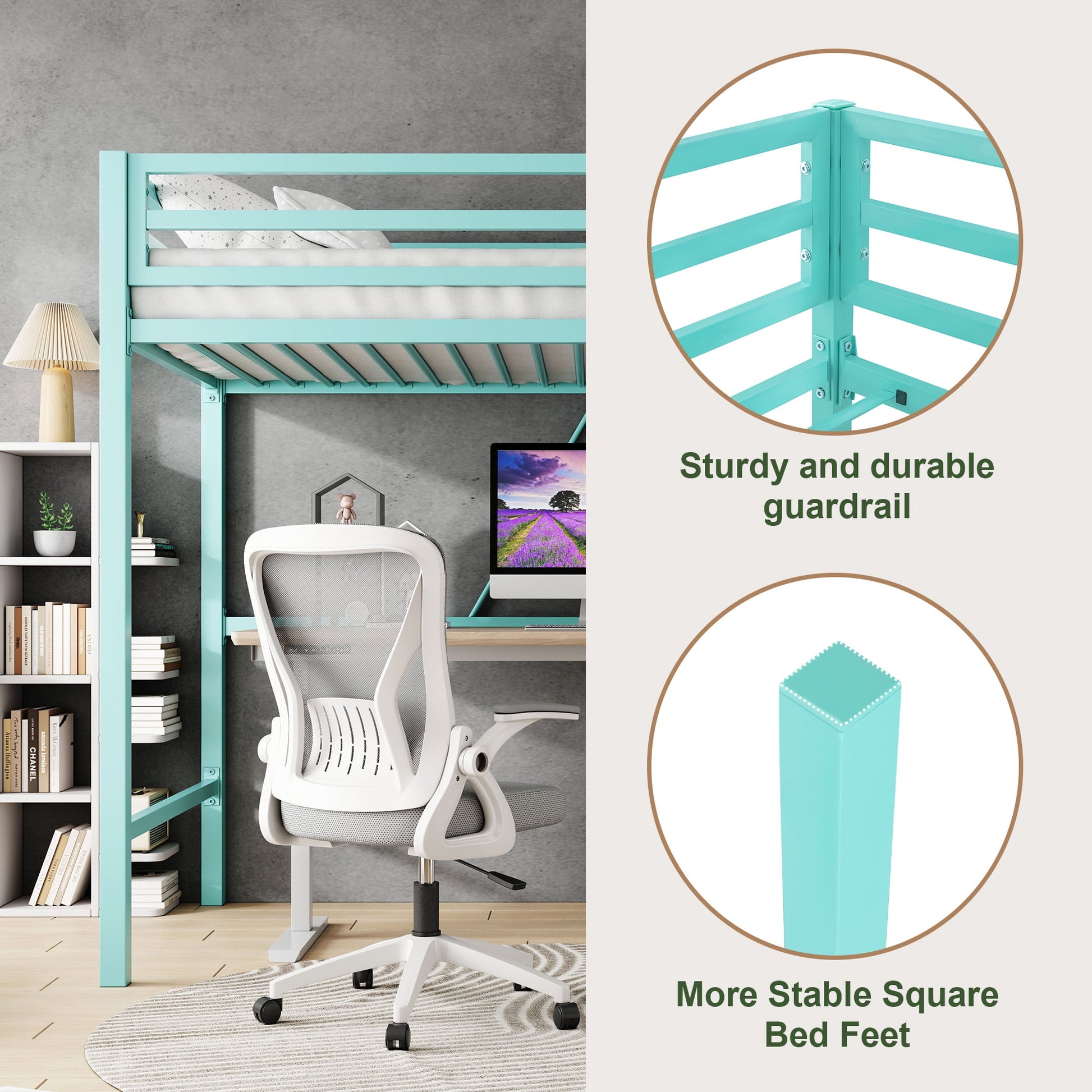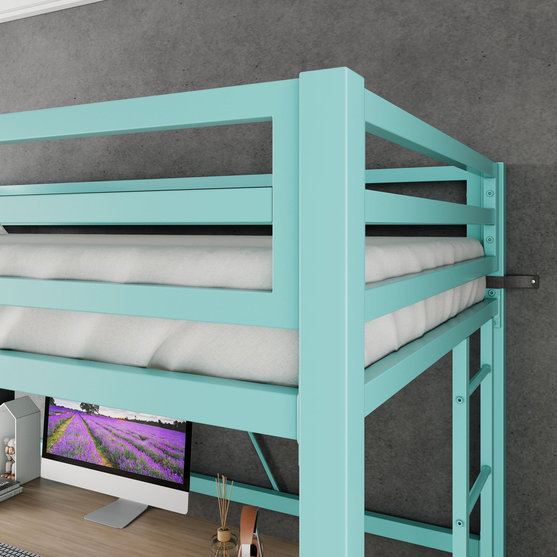 This AMOLIFE Modern Twin Loft Heavy Duty Metal Bunk Bed Frame with Ladder can support any mattress without adding box springs by meal slats. It is a bed with large volume storage space. All metal structure makes the whole bed has excellent load-bearing capacity. The ladder could be placed on either side of the bed, which is convenient for your setup. Heavy Duty Frame of ladder provide the safety for your climb. This bed could protect your peaceful sleep. When sleeping on the solid square frame, you can get the ultimate sleep quality. Besides, you can place your desk or shelves just under your bed, which can save more space for other furnitures like sofa, TV stand and so on, rationally organizing your bedroom.