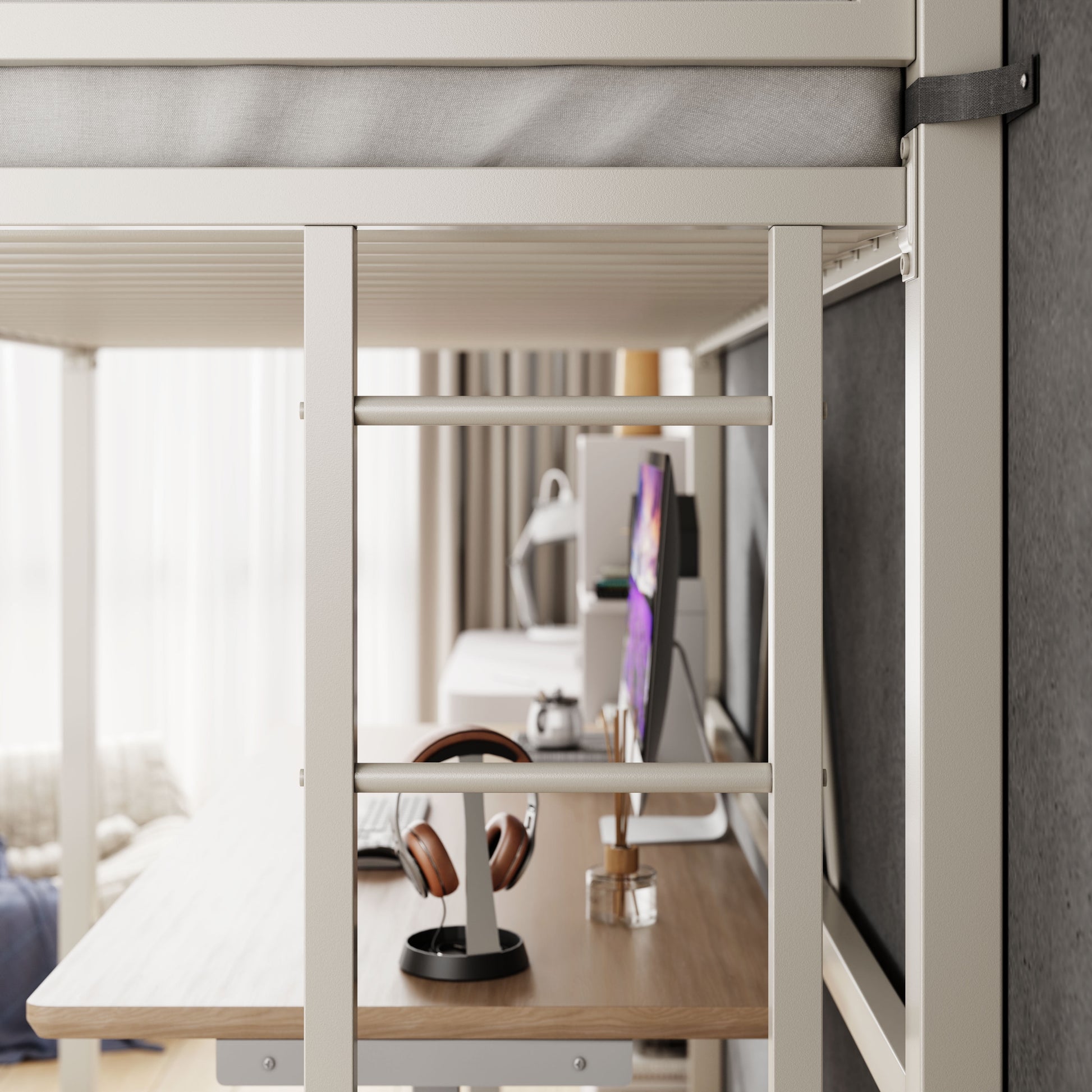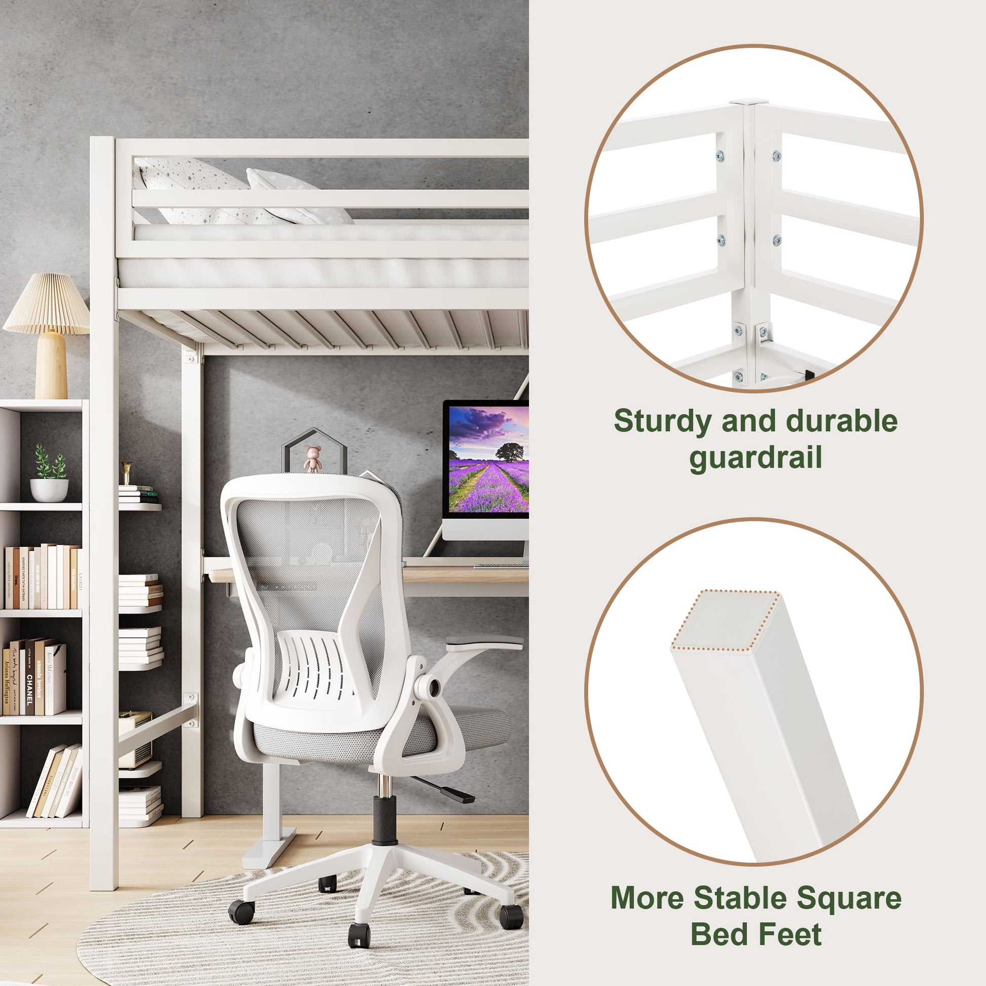 This AMOLIFE Modern Twin Loft Heavy Duty Metal Bunk Bed Frame with Ladder can support any mattress without adding box springs by meal slats. It is a bed with large volume storage space. All metal structure makes the whole bed has excellent load-bearing capacity. The ladder could be placed on either side of the bed, which is convenient for your setup. Heavy Duty Frame of ladder provide the safety for your climb. This bed could protect your peaceful sleep. When sleeping on the solid square frame, you can get the ultimate sleep quality. Besides, you can place your desk or shelves just under your bed, which can save more space for other furnitures like sofa, TV stand and so on, rationally organizing your bedroom.