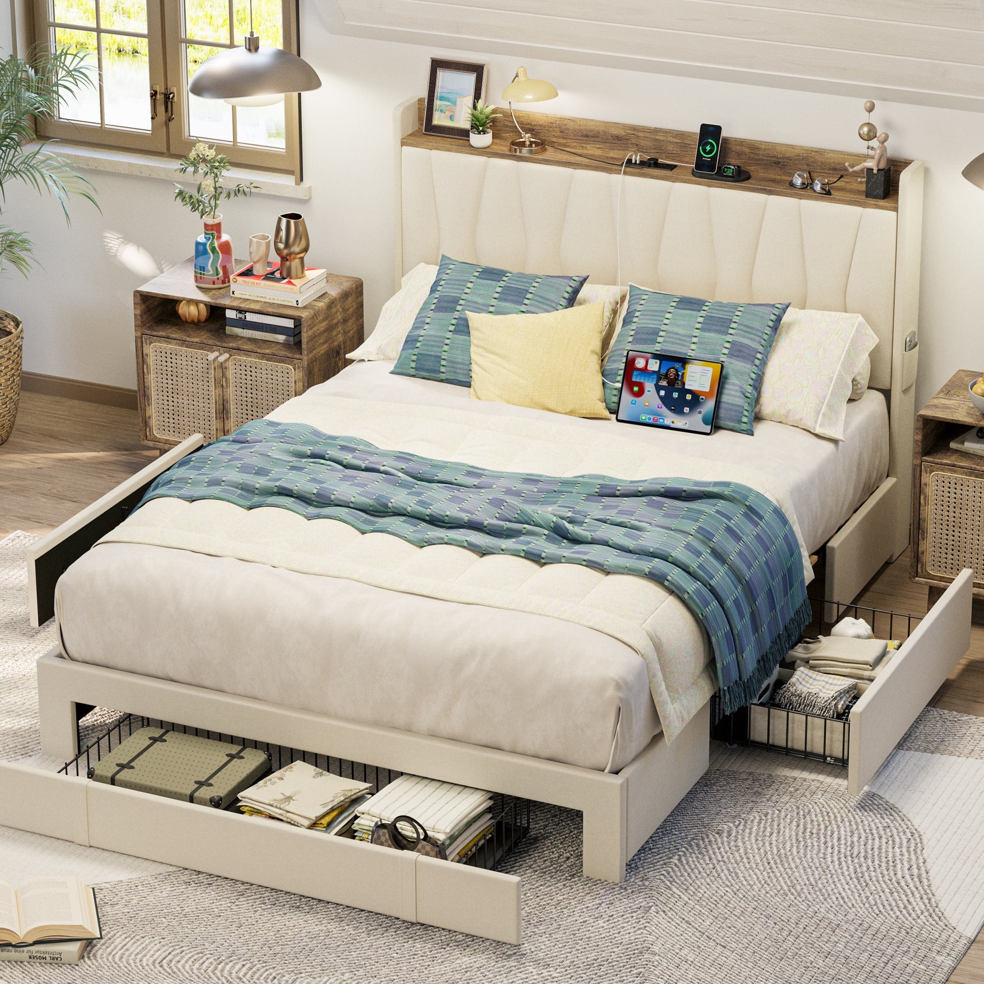 ANCTOR Full Size Bed Frame with Upholstered Storage Headboard, 3 Drawers, Charging Station, Sturdy