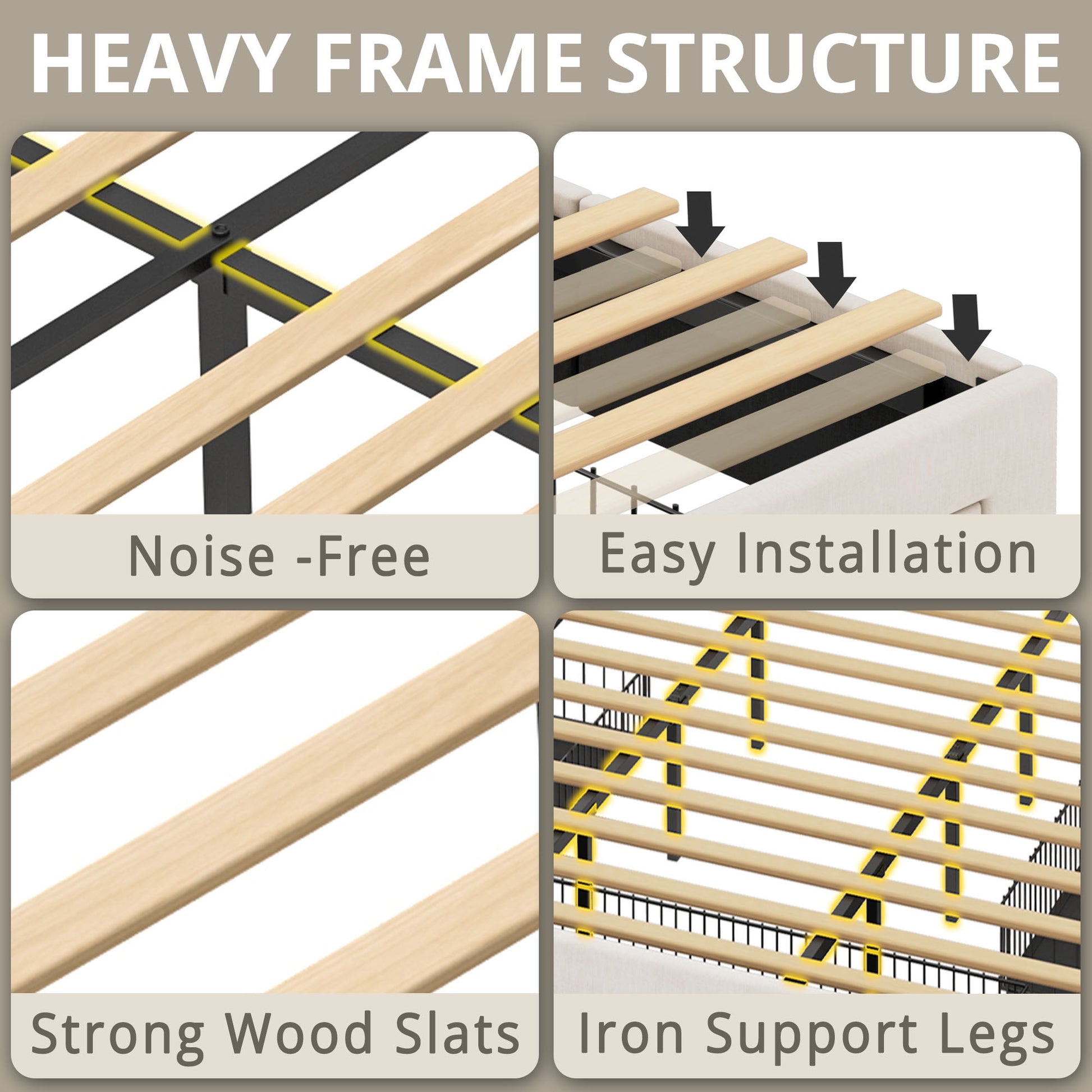 - [Sturdy Construction & Strong Support] In addition to the solid metal frame and central cross design of 12 thickened wooden slats, we have added a heavy duty steel support bar under the headboard to give the bed frame a weight capacity of 1300 lbs.