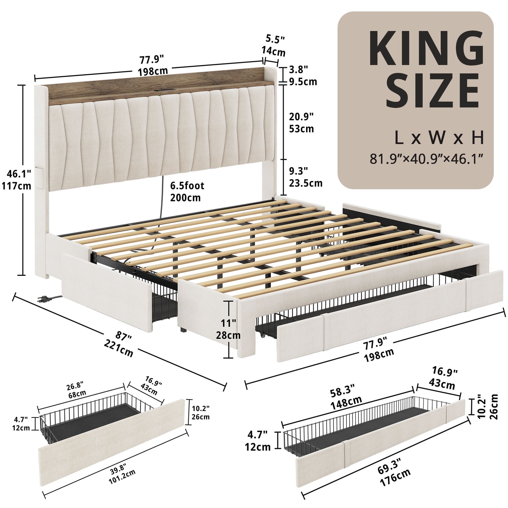ANCTOR King Bed Frame, Upholstered, USB Ports, 3 Drawers, No Box Spring Needed