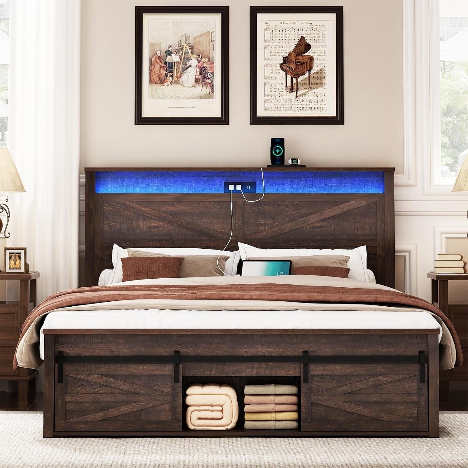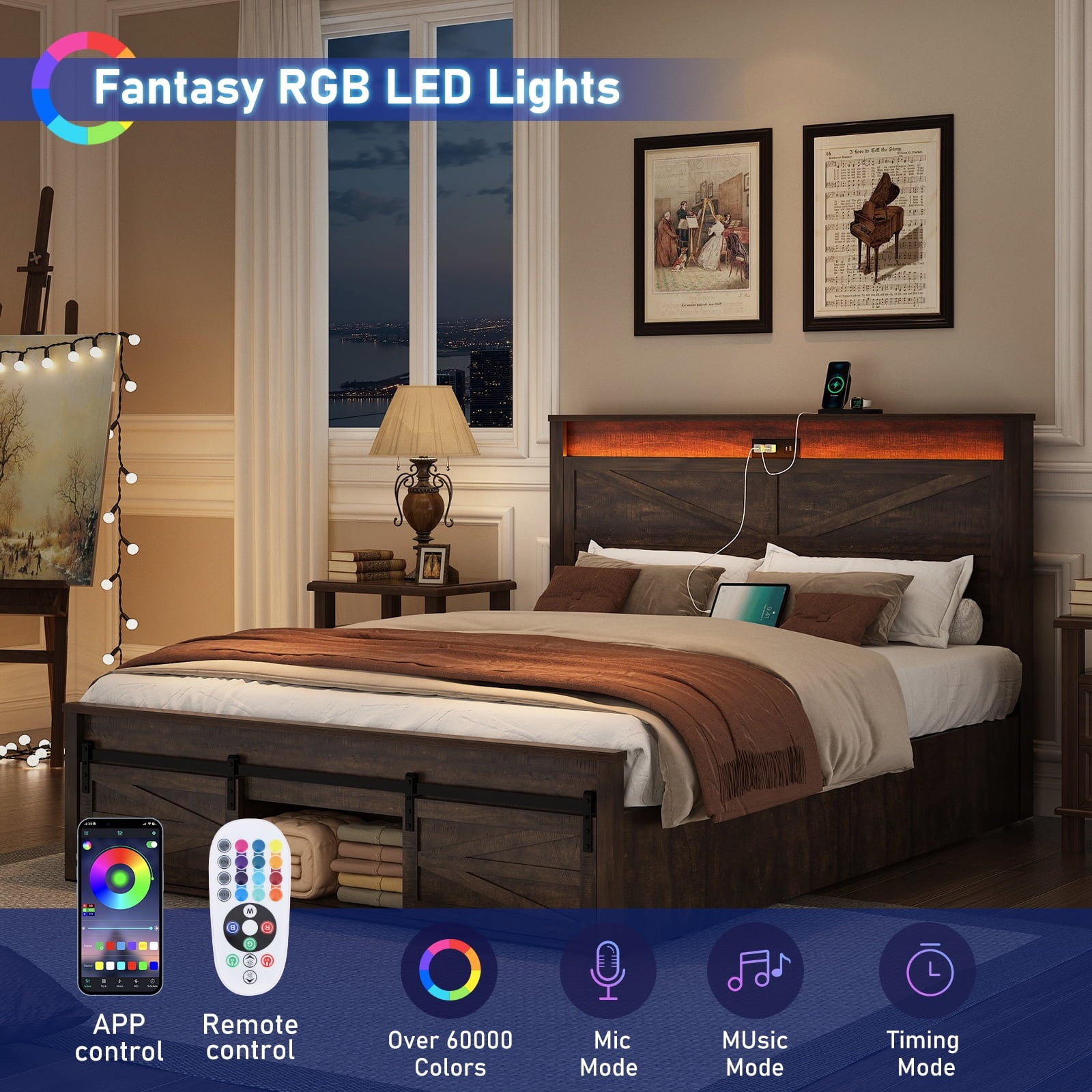 ANPOO Farmhouse Queen Size Bed Frame with LED Lights & Charging Station, Sliding Barn Door Storage Cabinet/Headboard,High Footboard, No Box Spring Needed, Noise-Free,White