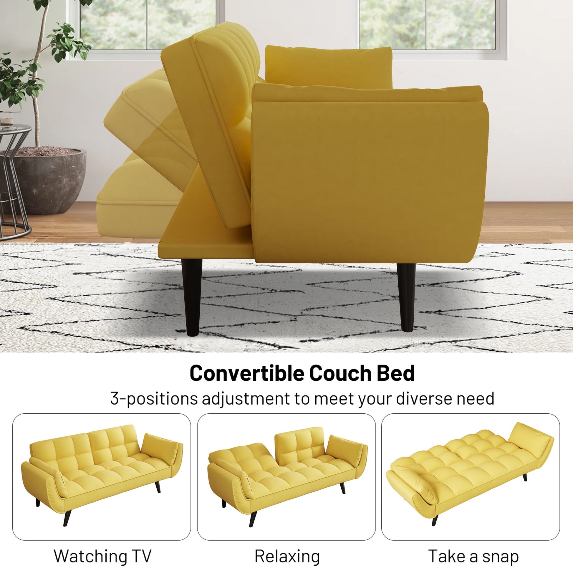 Aukfa 74in Flared Arm Futon Convertible Sofa Bed, Curved Sleeper Sofa for Home Office, Velvet, Yellow