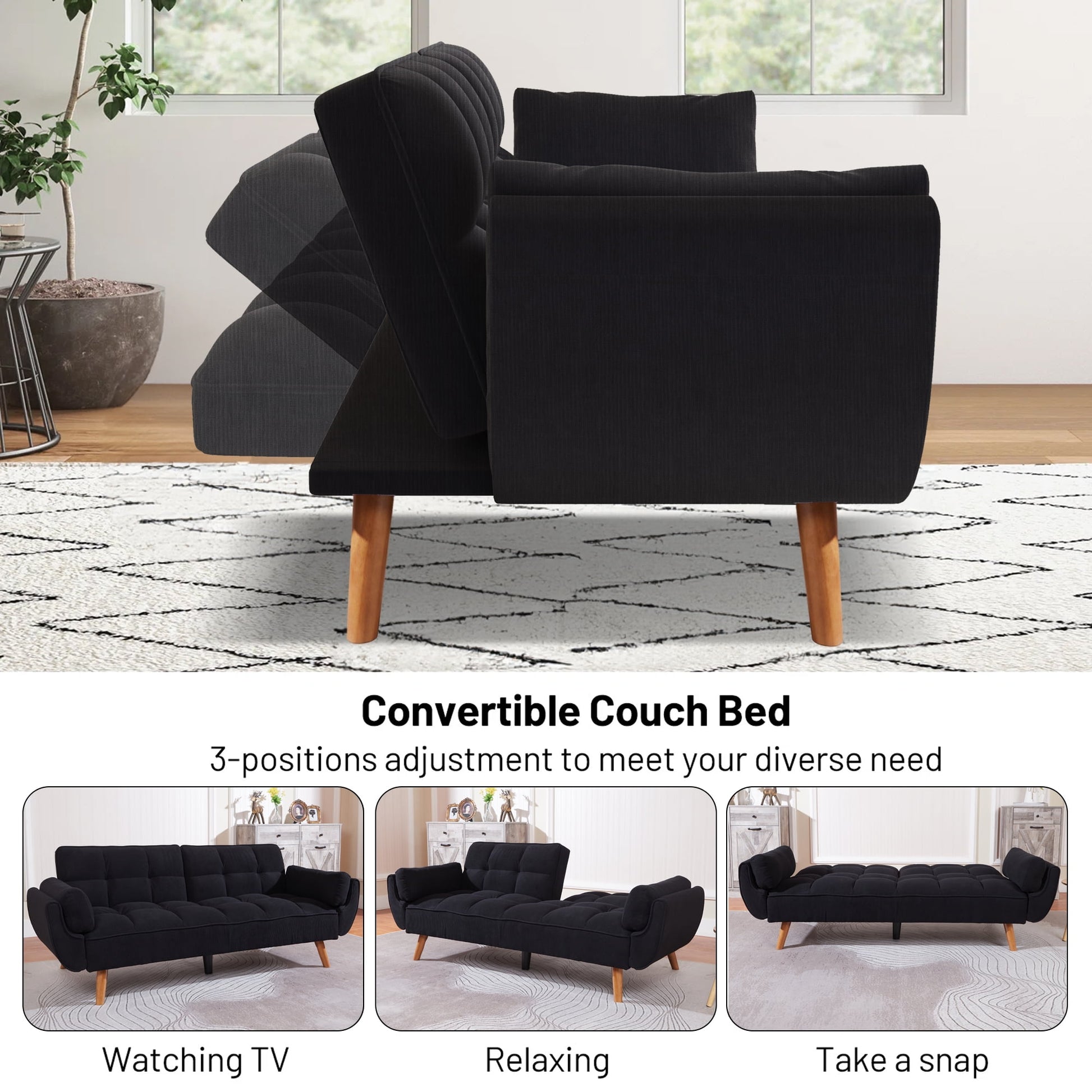 - CONVERTIBLE SOFA BED - This multi-functional futon sofa is designed with a folding backrest, and has three adjustable positions, which can easily convert into a recliner, where you can lie down to enjoy a movie, or convert into a sleeper to take a nap or for your friend's temporary overnight or a lounger to relax and read a book.