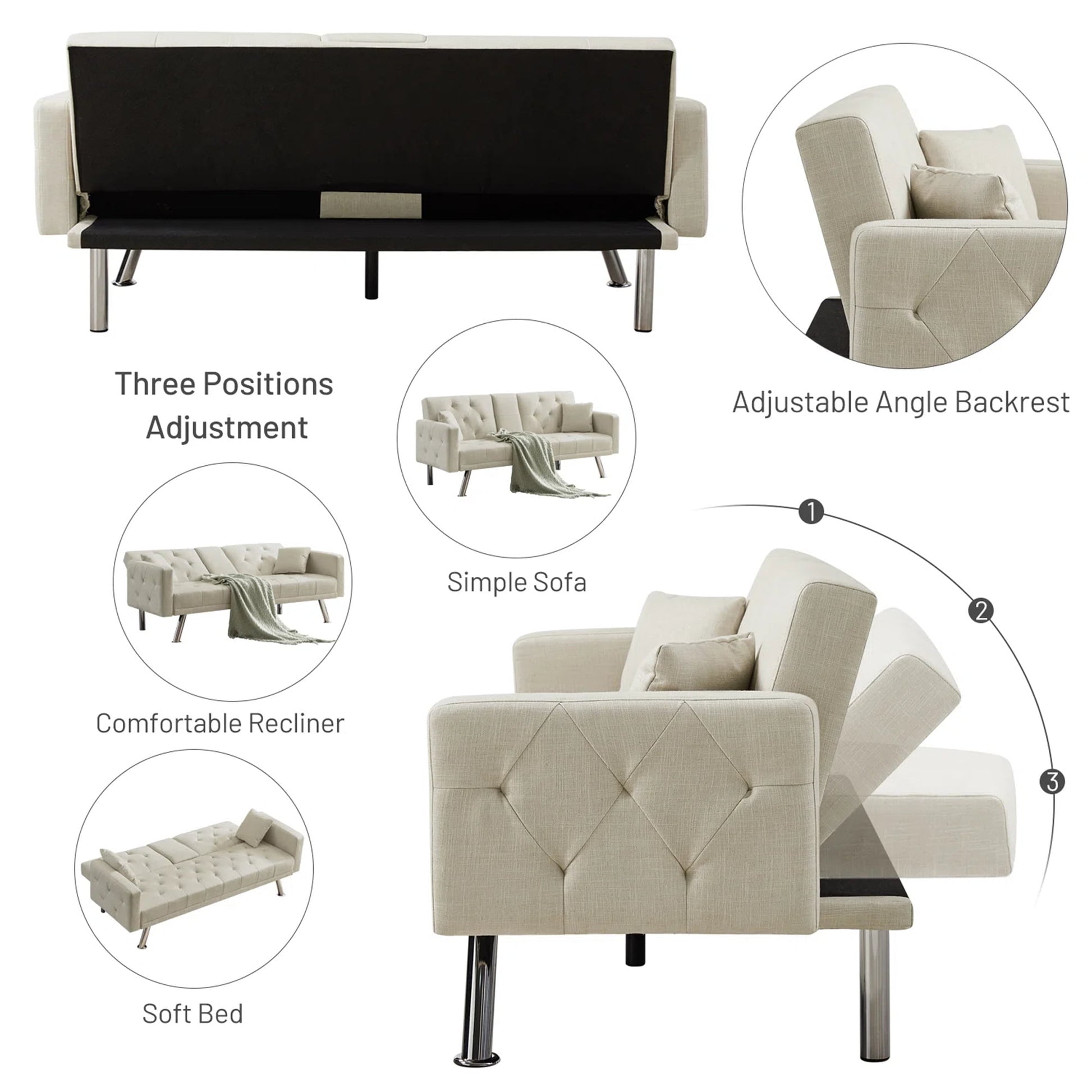 Aukfa 75in Tufted Futon Convertible Sofa Bed, Arm Couch for Home Office, 2 Pillow&Cup Holder, Beige