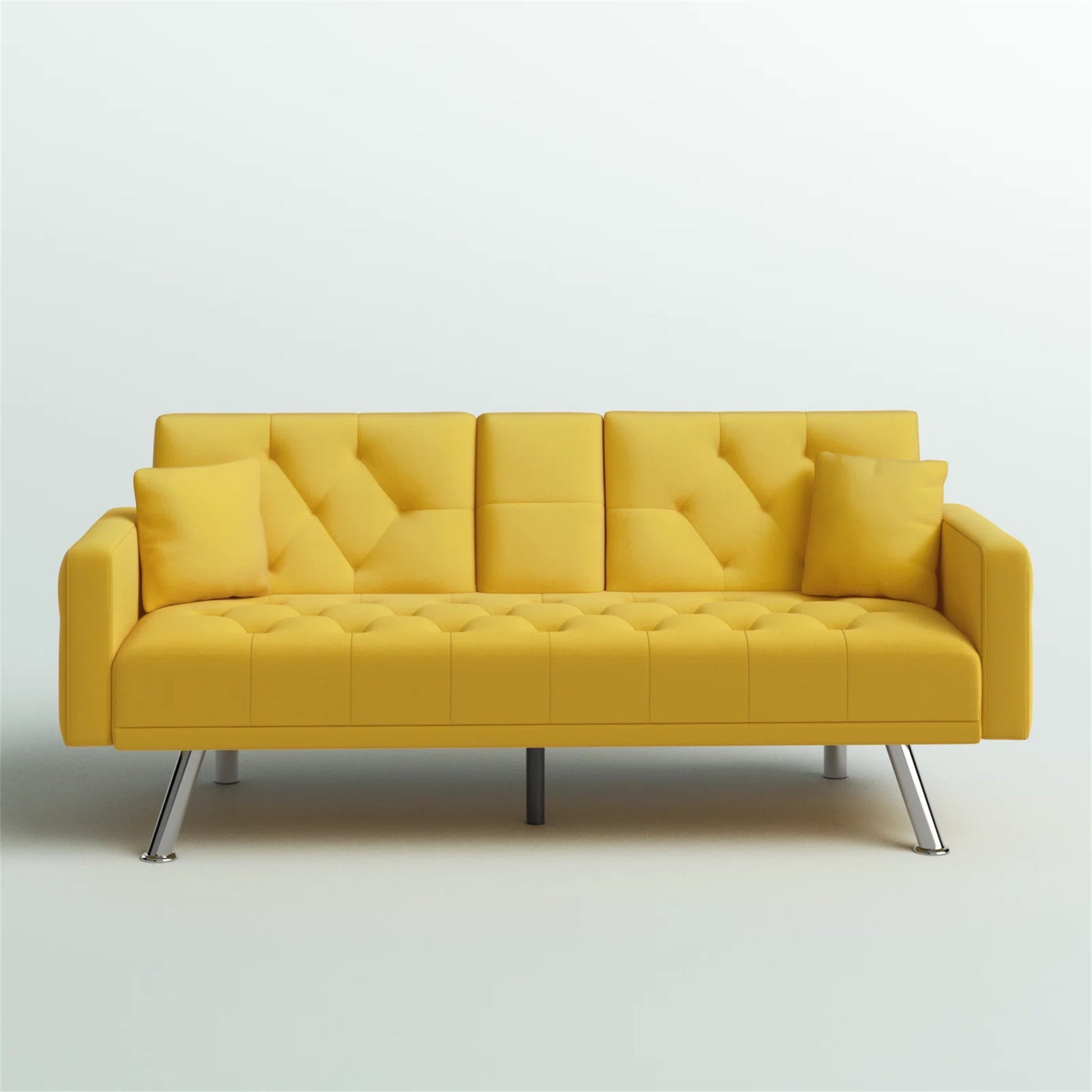 Aukfa 75in Tufted Futon Convertible Sofa Bed, Arm Couch for Home Office, 2 Pillow&Cup Holder, Yellow