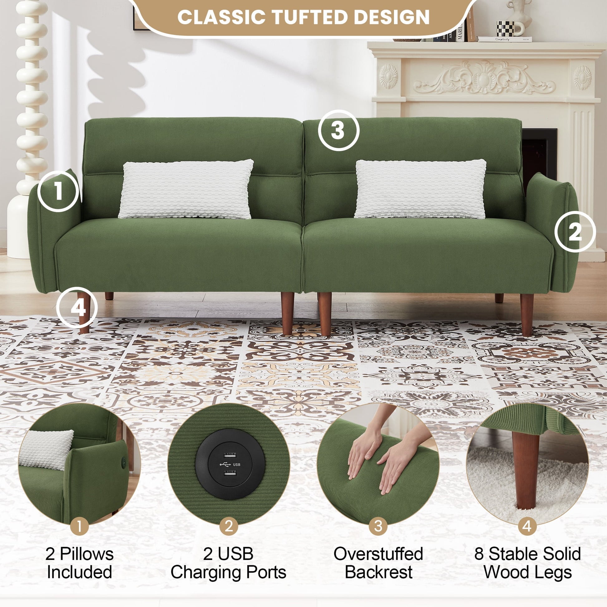 Introducing the ultimate multitasking solution for your living space - the Aukfa AK-FF01-075 convertible futon with 2 USB charging ports. At a generous 81 inches, this futon couch effortlessly combines style, functionality, and comfort to elevate your home d¨¦cor while providing versatile seating and sleeping options. Crafted with premium corduroy fabric, this futon sofa bed boasts a luxurious texture that's soft to the touch and easy to clean, ensuring both durability and elegance for years to come. Whether you're entertaining guests or enjoying a cozy movie night, the plush cushions and padded armrests offer exceptional comfort and support. Equipped with two built-in USB ports, you can effortlessly charge your devices without having to leave your seat. Transforming from a stylish sofa to a comfortable bed is quick and easy, thanks to the smooth and sturdy wood frame with multiple reclining positions. Simply adjust the backrest to your desired angle and create a cozy sleeping space for overnight guests or a quick nap. Included with the futon sofa bed are two matching pillows, adding an extra layer of comfort and style to your living room ensemble. Its modern design and neutral color palette seamlessly blend with any d¨¦cor scheme, making it the perfect addition to your living room, guest room, or home office.