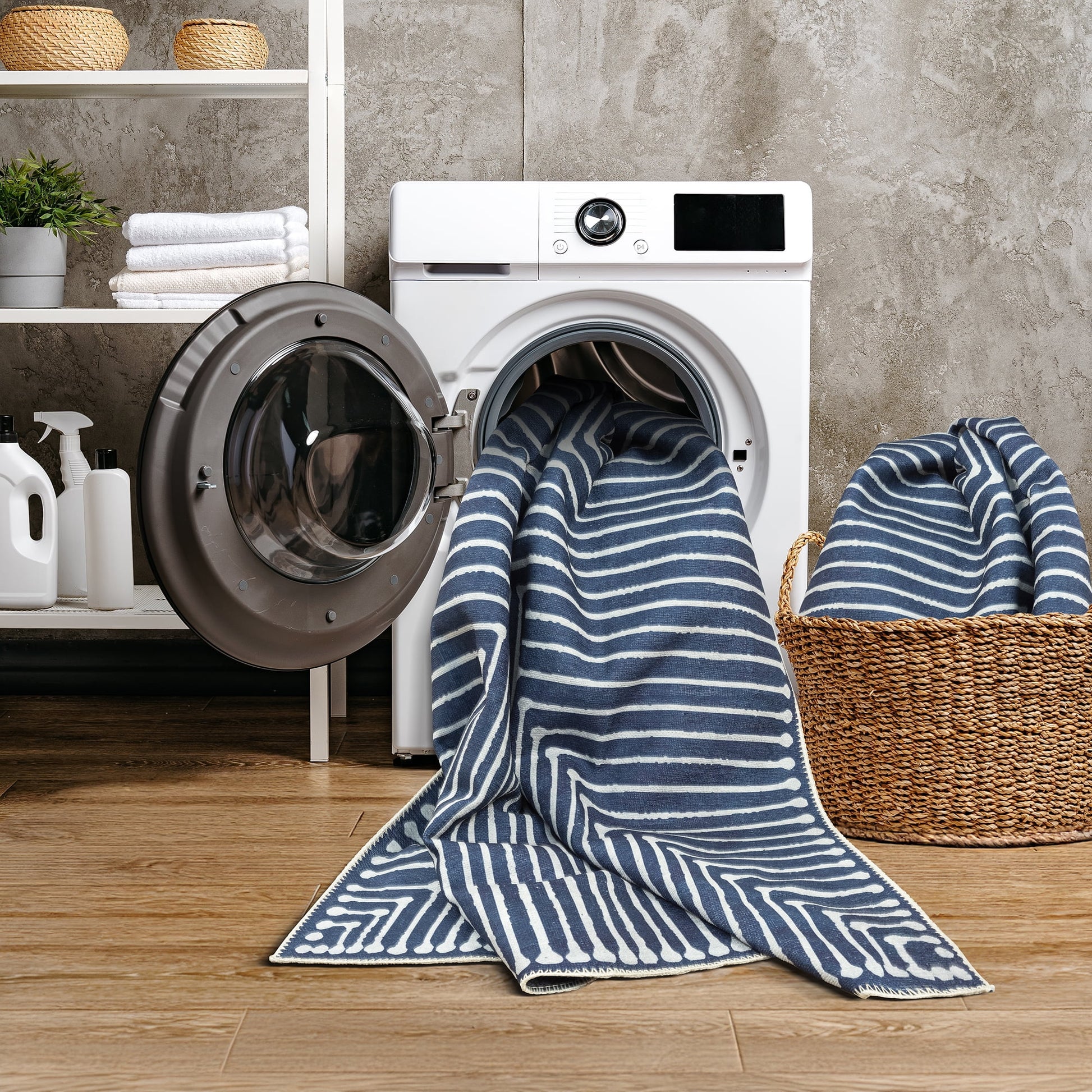 - Material: Our washable rugs are 100% Polyester with recycled cotton backing.