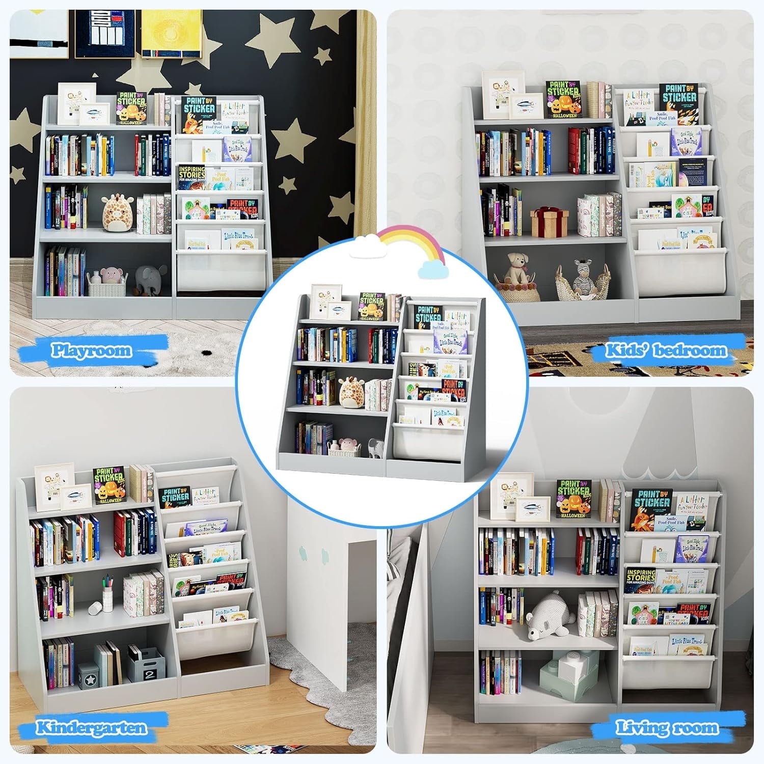- Toddler Bookshelf for Versatile Rooms: This sling bookshelf for kid is suitable for nursery, playroom, bedroom, classroom, kindergarten, living room, reading room...It can help your little one's books and toys more neatly and organized. This bookshelf organizer offers children a place to learn together, share fun knowledge with friends. Large and Ample Storage Space: 4 tier wooden book rack and 5 deep storage sling pockets mean that the organization possibilities are endless.