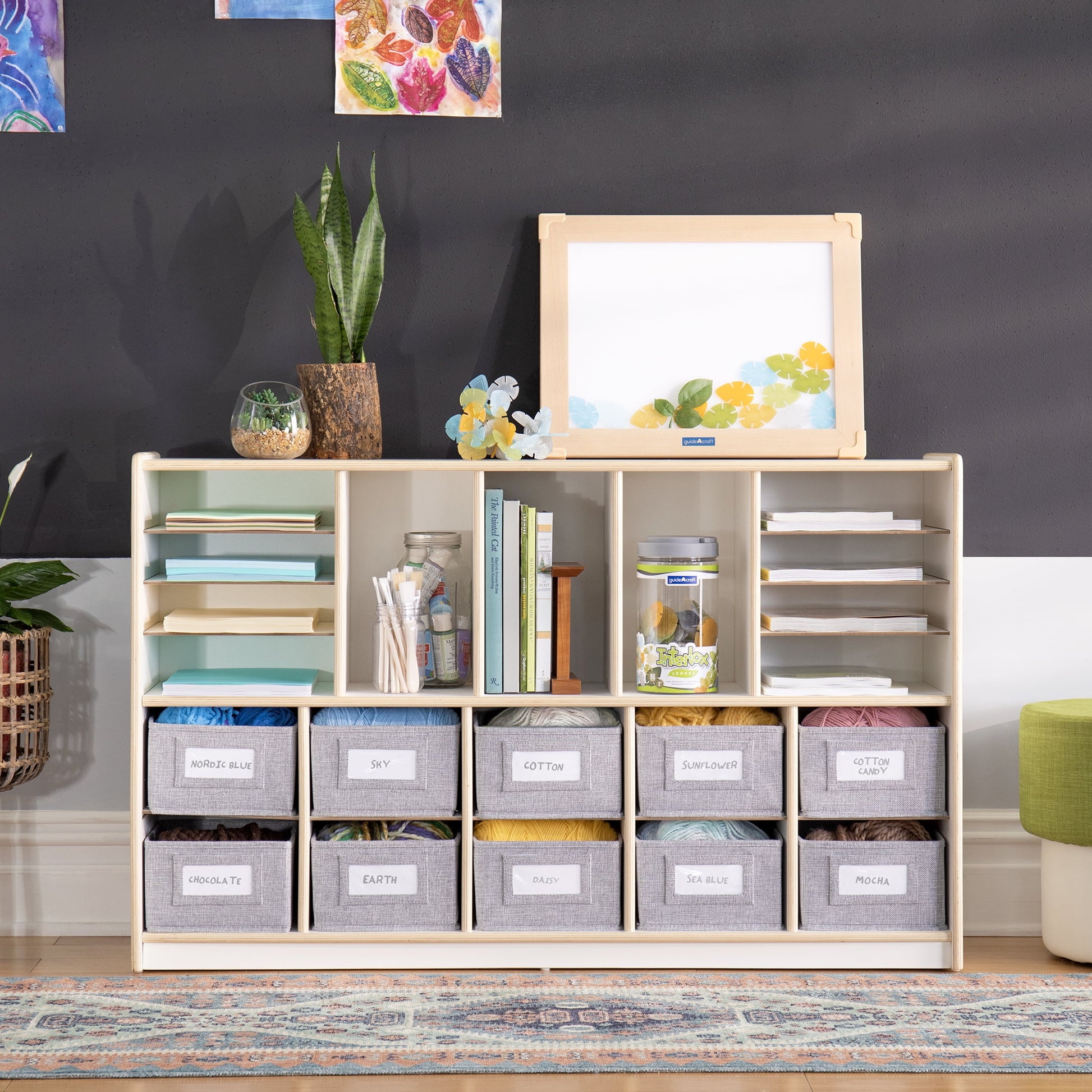 Guidecraft's EdQ collection satisfies practical storage and organizational needs in classrooms, homeschool environments and kids' play areas. The versatile, attractive furniture pieces in this complete collection provide opportunities for various easy configurations in any spaces where children learn and play. Keep kids' toys, books, art supplies and learning materials organized and accessible with the EdQ Shelves and 10 Bin Storage Unit. This spacious, compartmentalized unit features a variety of storage shelves and cubby spaces. A finished back panel prevents objects from falling through and allows for multiple room arrangement options.