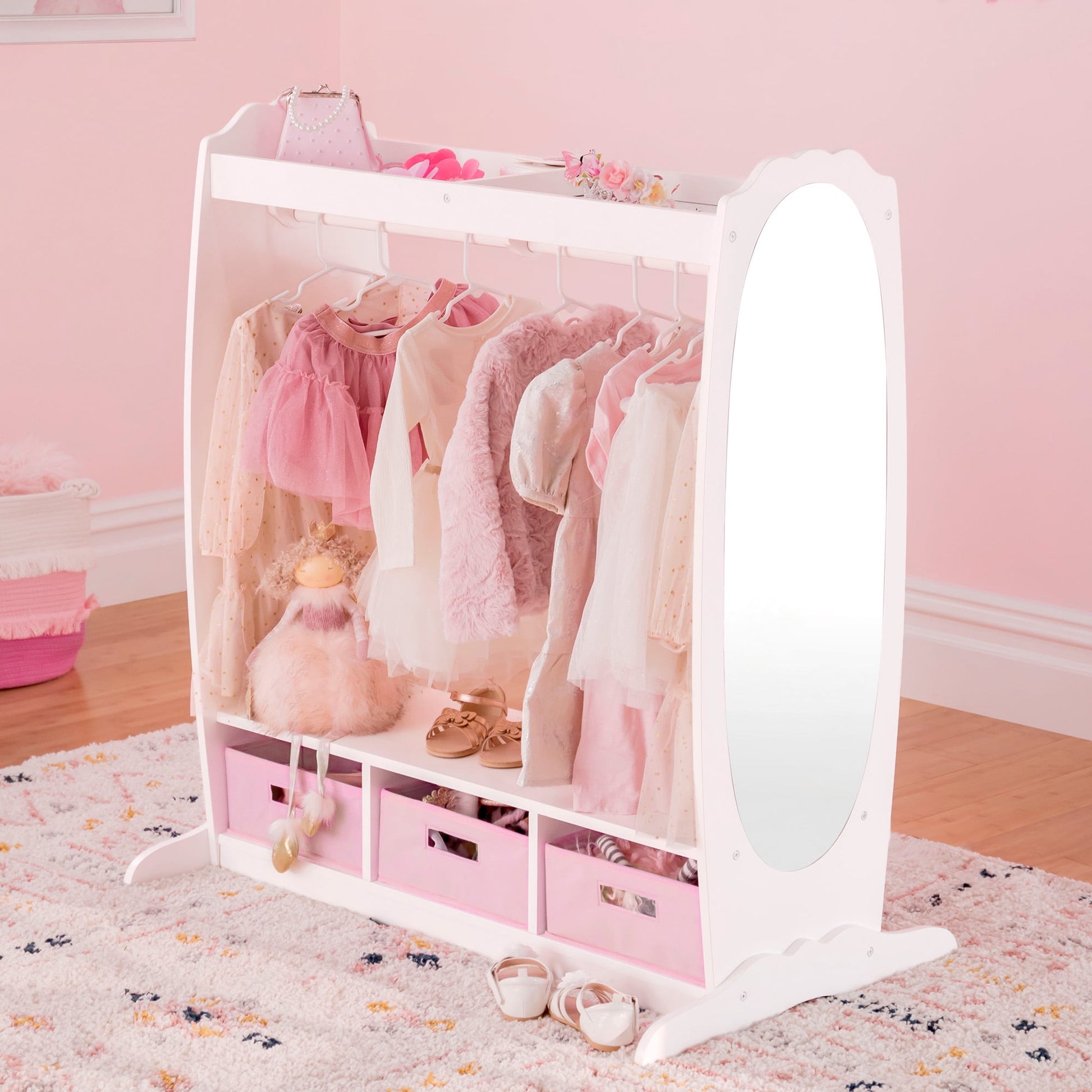 - ENCOURAGE IMAGINATION WITH A HIGH-QUALITY DRESS UP CENTER: Features a long rack for hanging kids' clothes, an upper shelf, full-length inset mirror, and divided bottom cubbies with fabric bins.